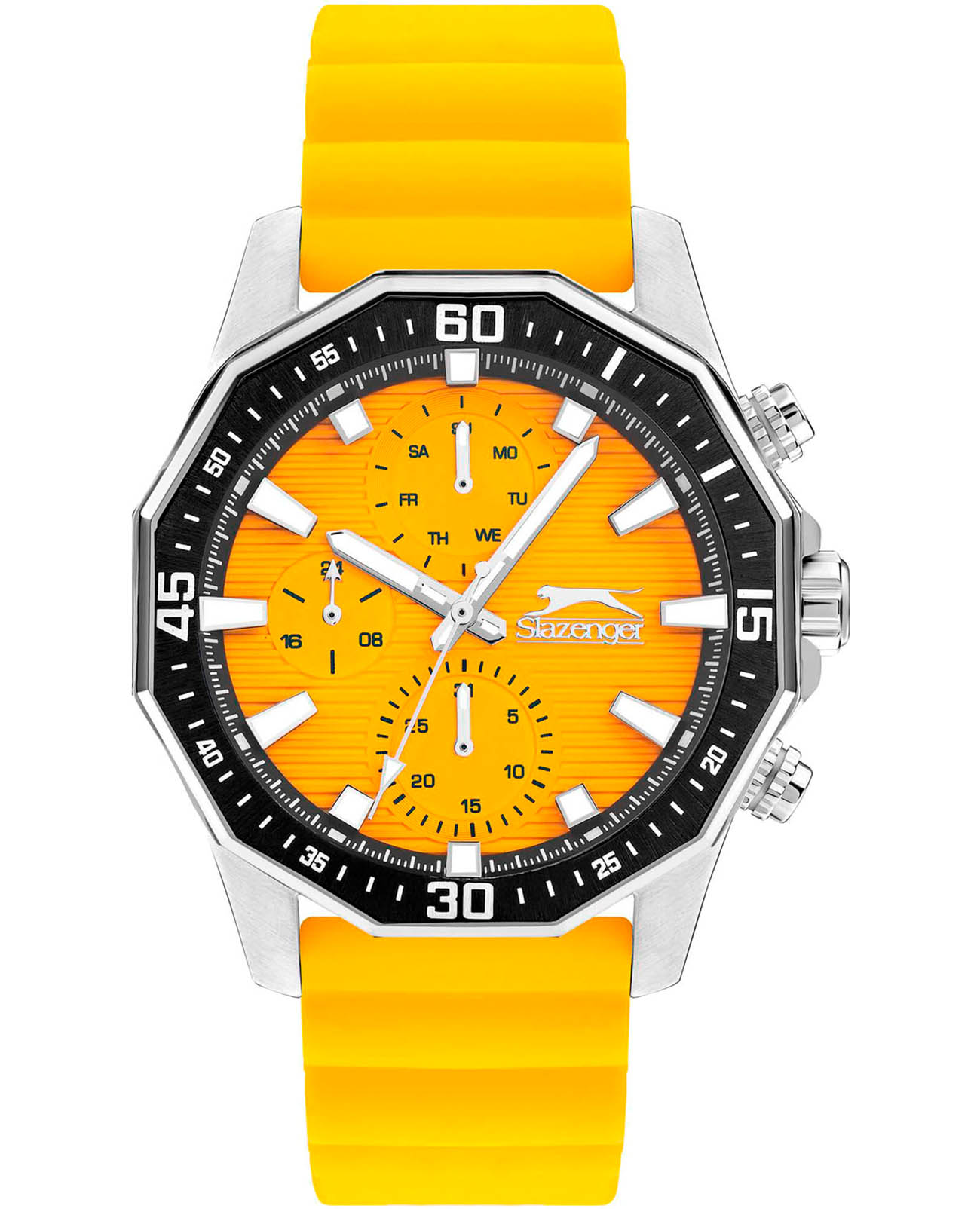Мужские кварцевые часы Slazenger SL.09.2298.2.02 — это выразительный и функциональный аксессуар, сочетающий прочность, стиль и насыщенную комплектацию. Корпус выполнен из суперметалла с PVD-покрытиемPVDУльтратонкое покрытие наносится в технике вакуумного напыления, сочетает в себе нитрид титана особой прочности со слоем золота или оксида хрома. Несёт в себе декоративную или защитную функцию., а лицевая часть защищена минеральным стекломМинеральное стеклоМинеральное стекло представляет собой искусственно выращенный минерал кварца. Такое стекло отличается особой устойчивостью к повреждениям и царапинам. Уступает по некоторым качествам сапфировому стеклу.. Циферблат оранжевого цвета оформлен с вынесенными малыми циферблатами для индикации дня недели, даты и 24-часового формата времени. Стрелки и метки покрыты люминесцентным покрытиемЛюминесцентное покрытиеПозволяет считывать показания времени в темноте. Производители наносят на стрелки, часовые индексы, безель или поверхность циферблата светонакопительный состав, дающий холодное свечение., что обеспечивает хорошую читаемость в темноте. Часы оснащены силиконовым ремешком, фиксирующимся на стандартной застёжке. Водонепроницаемость 50 м позволяет использовать часы в повседневных условиях, защищая от случайных брызг и капель дождя. Модель подчёркивает индивидуальность владельца и идеально подходит как для повседневного, так и для спортивного образа.