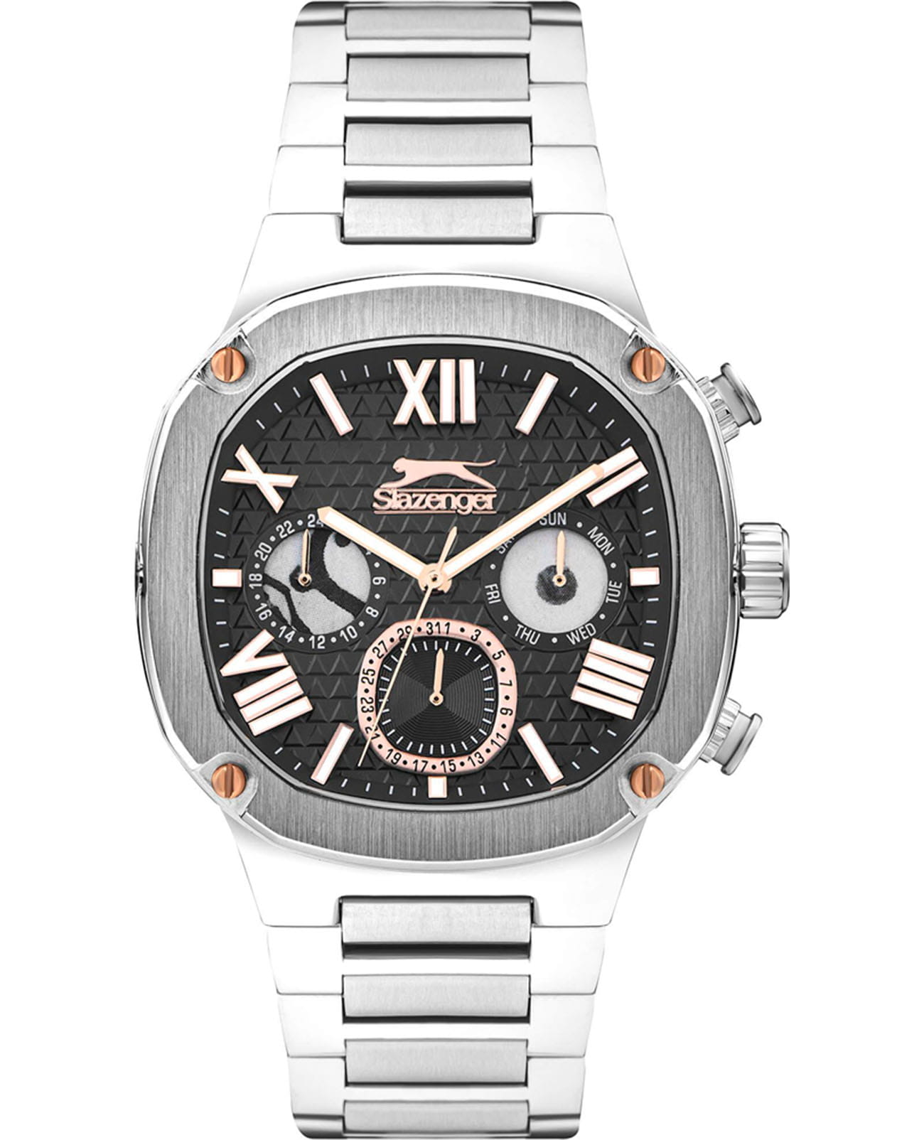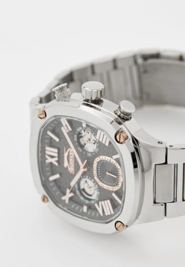 Мужские кварцевые часы Slazenger SL.09.2320.2.03 — это выразительный и функциональный аксессуар, сочетающий стиль, прочность и насыщенную комплектацию. Корпус и браслет выполнены из суперметалла, а циферблат частично скелетонизирован и оформлен в чёрных тонах, что позволяет наблюдать за работой механизма. Циферблат защищён минеральным стекломМинеральное стеклоМинеральное стекло представляет собой искусственно выращенный минерал кварца. Такое стекло отличается особой устойчивостью к повреждениям и царапинам. Уступает по некоторым качествам сапфировому стеклу. и дополнен вынесенными малыми циферблатами для индикации дня недели, даты и времени в 24-часовом формате. Стрелки и метки оснащены люминесцентным покрытиемЛюминесцентное покрытиеПозволяет считывать показания времени в темноте. Производители наносят на стрелки, часовые индексы, безель или поверхность циферблата светонакопительный состав, дающий холодное свечение., обеспечивающим хорошую читаемость в темноте. Завинчивающаяся задняя крышка повышает надёжность конструкции. Браслет из суперметалла фиксируется на раскладной застёжкеРаскладная застёжкаТакой тип застёжки используется только на браслетах из металла. Она никогда не раскрывается полностью, происходит разделение на 2 и более частей. Раскладывающая застёжка снизит вероятность потери часов к минимуму., обеспечивая удобство и безопасность ношения. Водонепроницаемость 50 м позволяет использовать часы в повседневных условиях, защищая от случайных брызг и капель дождя. Модель подчёркивает индивидуальность владельца и идеально подходит как для повседневного, так и для делового образа.