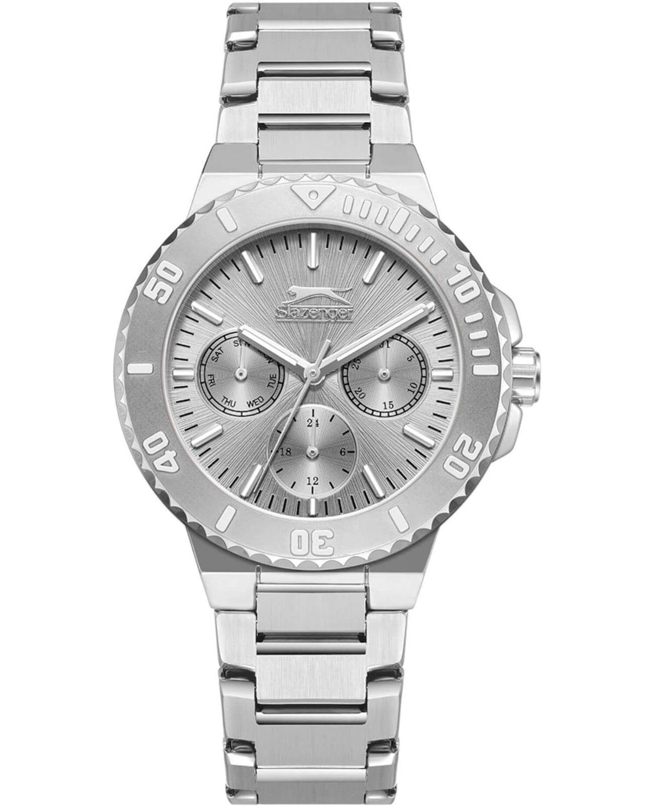 Женские кварцевые часы Slazenger — это выразительный и функциональный аксессуар. Корпус диаметром 36 мм и толщиной 9,5 мм выполнен из суперметалла. Циферблат серебристого цвета оформлен индексами и стрелками. Циферблат защищён минеральным стекломМинеральное стеклоМинеральное стекло представляет собой искусственно выращенный минерал кварца. Такое стекло отличается особой устойчивостью к повреждениям и царапинам. Уступает по некоторым качествам сапфировому стеклу.. Механизм — кварцевый. Часы оснащены индикацией дня недели, даты и 12/24-часового формата времени. Часы оснащены браслетом из суперметалла с раскладной застёжкойРаскладная застёжкаТакой тип застёжки используется только на браслетах из металла. Она никогда не раскрывается полностью, происходит разделение на 2 и более частей. Раскладывающая застёжка снизит вероятность потери часов к минимуму.. Водонепроницаемость 50 м позволяет использовать часы в повседневных условиях. Гарантия — 12 месяцев. Идеальный выбор для тех, кто ценит стиль, функциональность и качество.