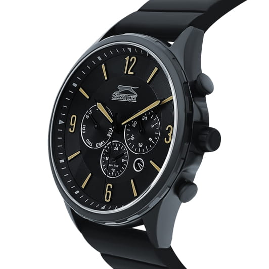 Мужские кварцевые часы Slazenger — это выразительный и функциональный аксессуар. Корпус диаметром 46 мм и толщиной 11 мм выполнен из суперметалла с IP-покрытиемIP-покрытиеМетод ионного напыления. Демонстрирует повышенную устойчивость к истиранию, окислению и химическим веществам. Под воздействием высокого давления и температуры около 1500°C молекулы металла надёжно соединяются с частицами корпуса часов.. Циферблат чёрного цвета оформлен индексами, стрелками и двумя вынесенными субциферблатами: для отображения дня недели и 24-часового формата времени. Окошко даты расположено между 4 и 5 часами. Присутствует указатель второго часового пояса (GMTВторой часовой поясФункция, позволяющая отображать время двух часовых поясов одновременно.). Циферблат защищён минеральным стекломМинеральное стеклоМинеральное стекло представляет собой искусственно выращенный минерал кварца. Такое стекло отличается особой устойчивостью к повреждениям и царапинам. Уступает по некоторым качествам сапфировому стеклу.. Часы оснащены силиконовым ремешком на классической пряжке. Водонепроницаемость 50 м позволяет использовать часы в повседневных условиях. Идеальный выбор для тех, кто ценит стиль и качество.