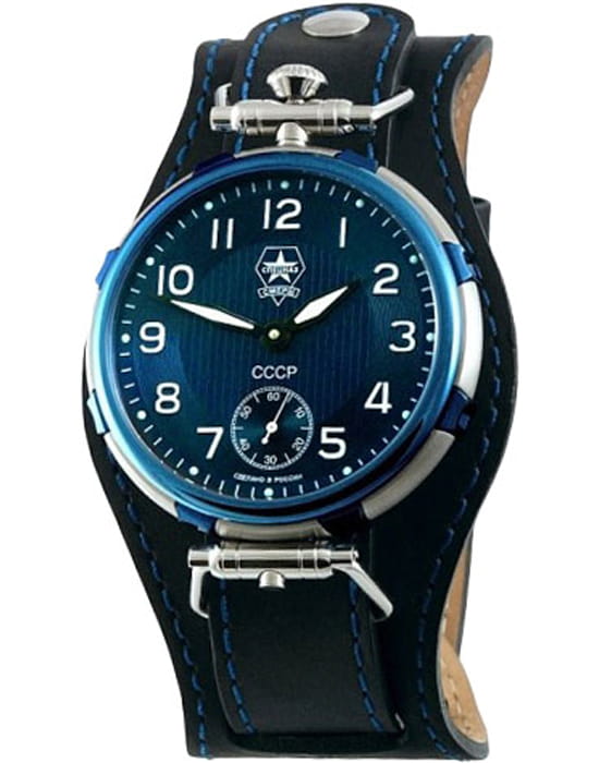 Часы Спецназ "Смерш" C9457326-3603 — коллекционная модель, посвящённая легендарной службе военной контрразведки "СМЕРШ". Корпус диаметром 46 мм выполнен из нержавеющей стали, а белый циферблат защищён минеральным стекломМинеральное стеклоМинеральное стекло представляет собой искусственно выращенный минерал кварца. Такое стекло отличается особой устойчивостью к повреждениям и царапинам. Уступает по некоторым качествам сапфировому стеклу. с сапфировым покрытием. БезельБезельВнешний ободок, закрепляющий стекло. В спортивных часах так называется поворотное кольцо с делениями на циферблате, выполняет роль таймера – замеряет отрезки времени на шкале. Неподвижный безель – элемент декора. Однонаправленно вращающийся безель на дайверских часах позволяет фиксировать моменты погружения и выныривания на поверхность. с PVD-покрытиемPVDУльтратонкое покрытие наносится в технике вакуумного напыления, сочетает в себе нитрид титана особой прочности со слоем золота или оксида хрома. Несёт в себе декоративную или защитную функцию..