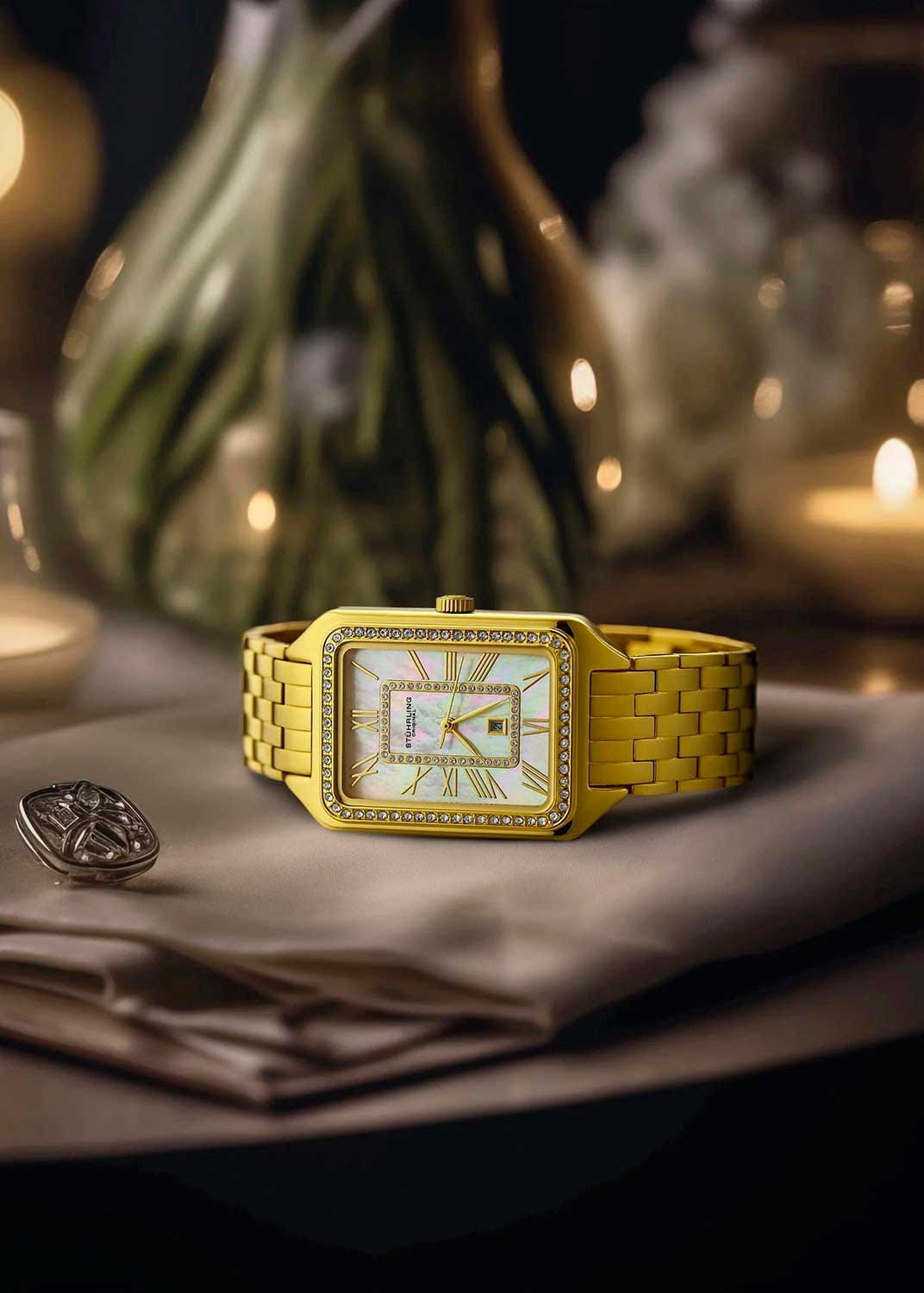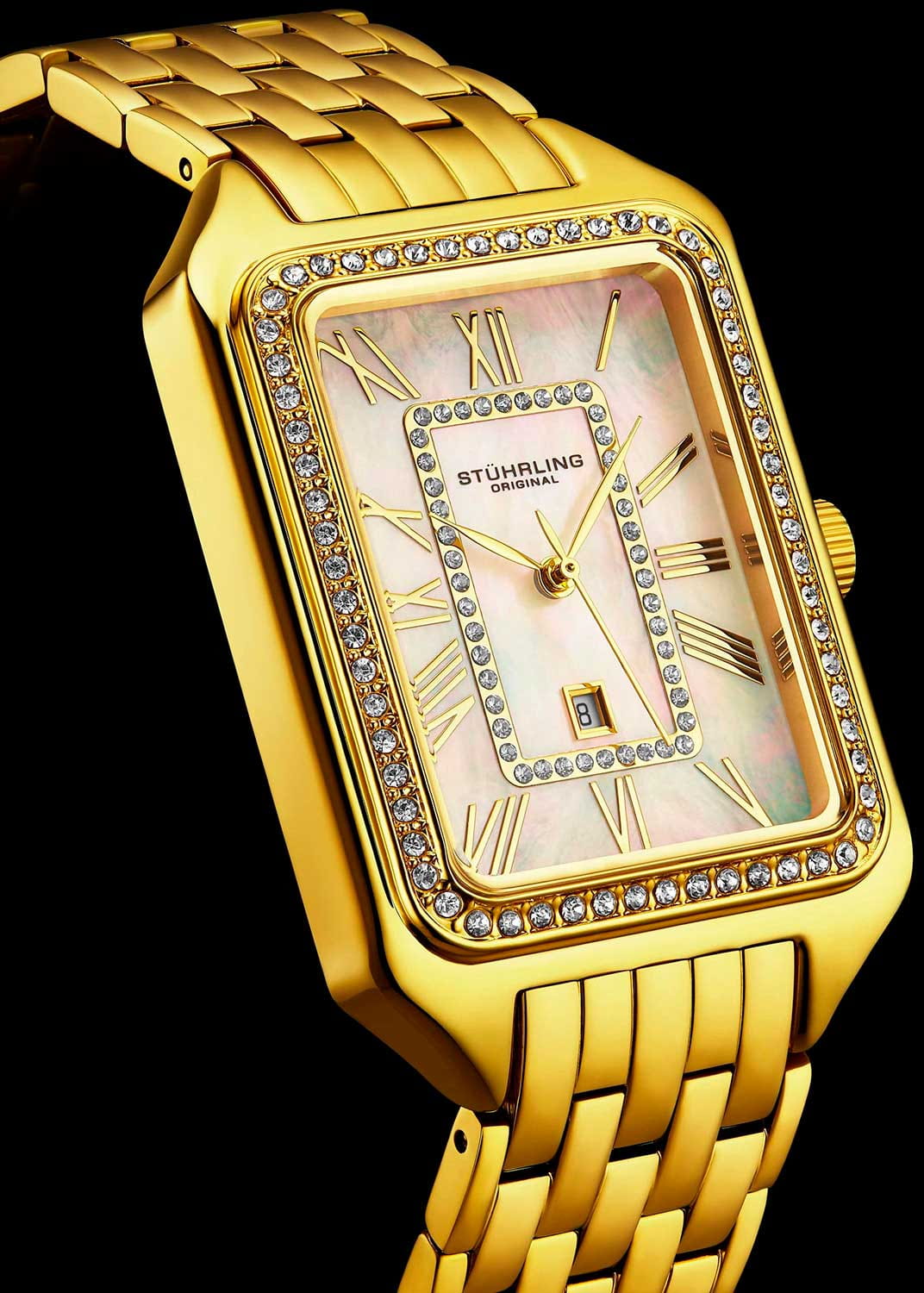 Stuhrling 4061.3 — изысканные женские часы, созданные в духе утончённой элегантности и современного гламура. Прямоугольный корпус с инкрустацией по периметру сияет на свету, подчёркивая благородство глубокого циферблата с утончёнными римскими цифрами и изящными стрелками. Центральная декоративная рамка придаёт модели архитектурную глубину и изысканный блеск. Корпус и браслет выполнены с PVD-покрытиемPVDУльтратонкое покрытие наносится в технике вакуумного напыления, сочетает в себе нитрид титана особой прочности со слоем золота или оксида хрома. Несёт в себе декоративную или защитную функцию. из нержавеющей стали, обеспечивая прочность и долговечность, а надёжная раскладная застёжкаРаскладная застёжкаТакой тип застёжки используется только на браслетах из металла. Она никогда не раскрывается полностью, происходит разделение на 2 и более частей. Раскладывающая застёжка снизит вероятность потери часов к минимуму. гарантирует комфортное и безопасное ношение. Циферблат защищён фирменным стеклом Krysterna, устойчивым к ударам и царапинам. Stuhrling — это гармония блеска, стиля и надёжности, идеально подходящая для женщины, ценящей классическую форму и современное сияние.