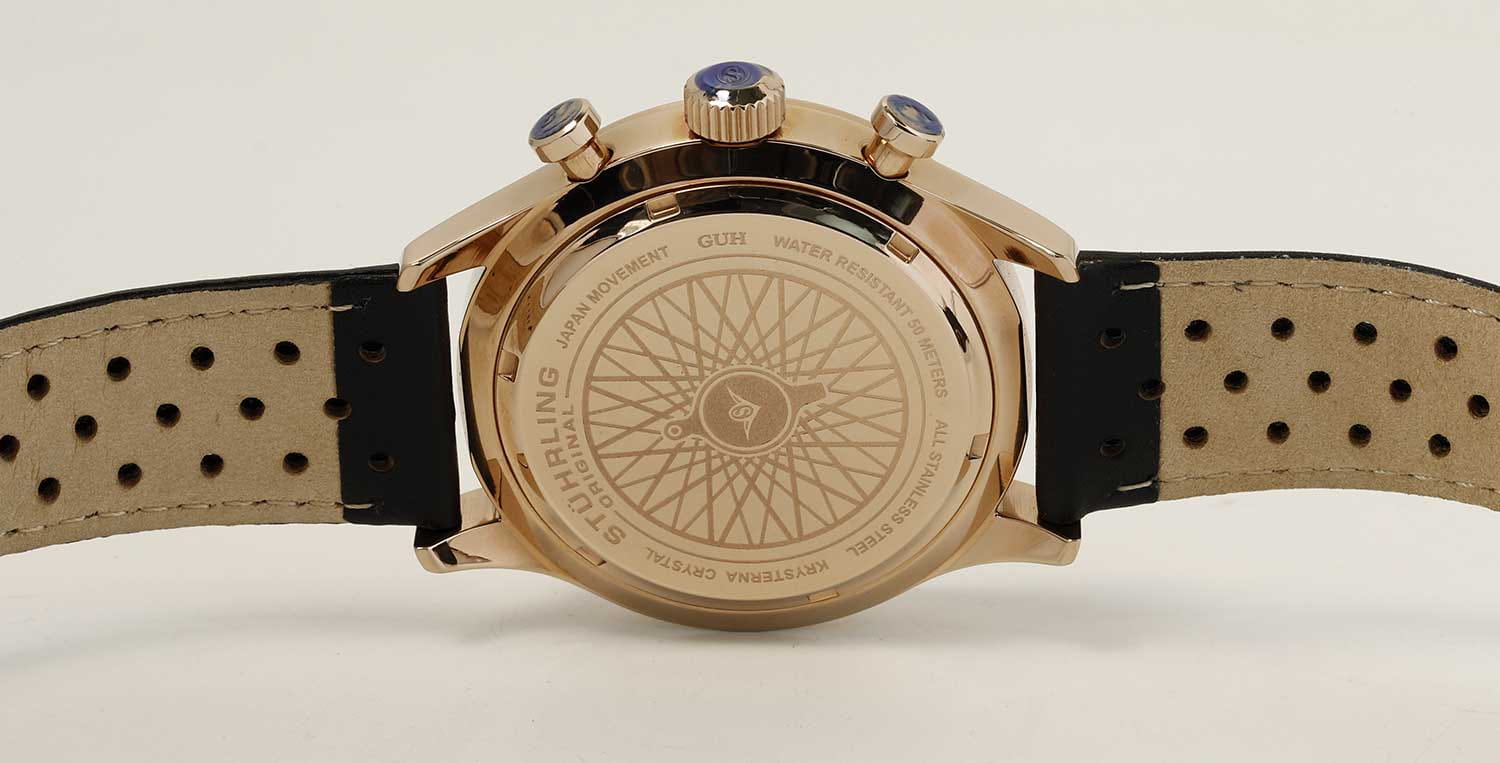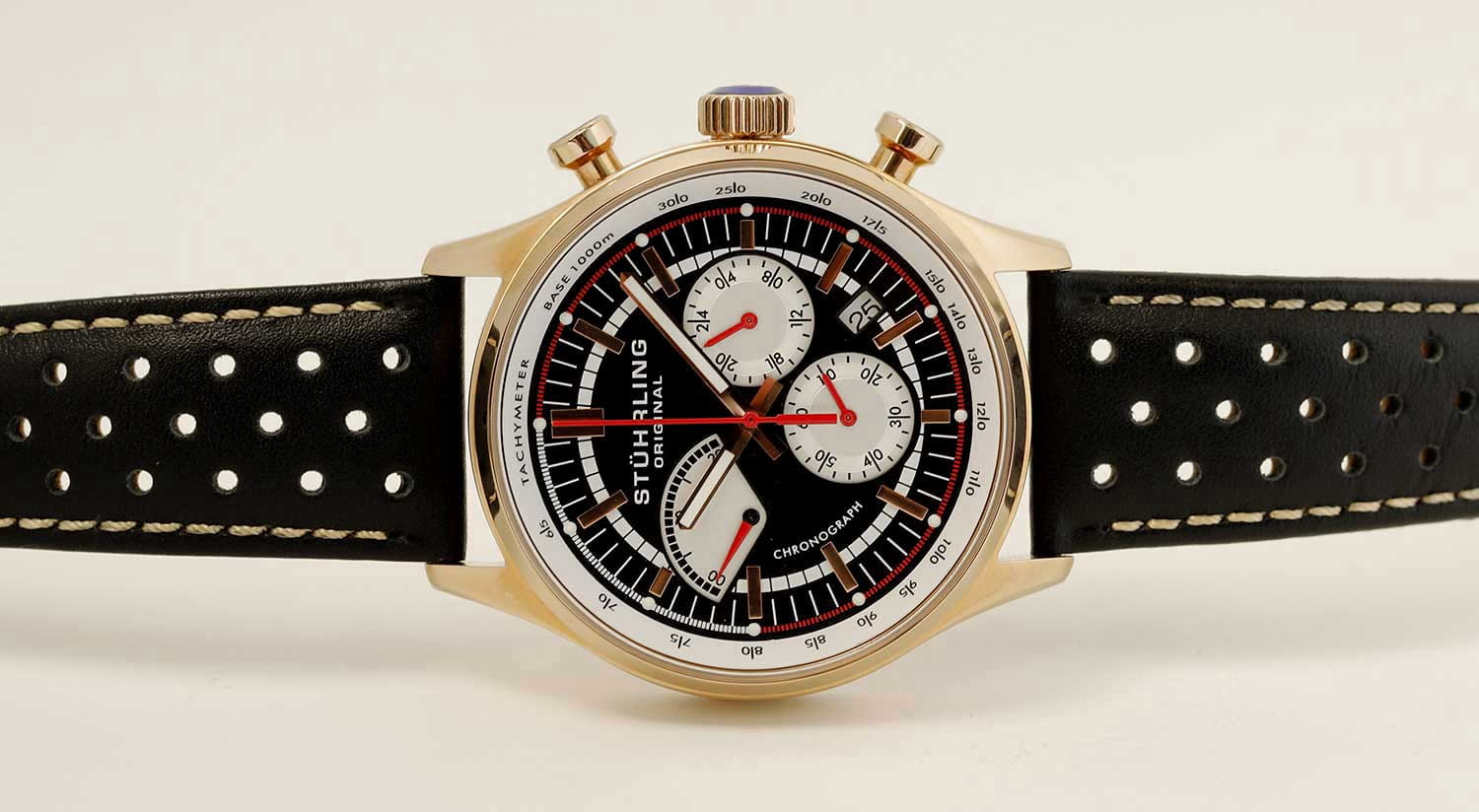 Stuhrling 934.03 — эффектные мужские часы в спортивно-классическом стиле, сочетающие энергичный характер и элегантное исполнение. Корпус с изысканным PVD-покрытиемPVDУльтратонкое покрытие наносится в технике вакуумного напыления, сочетает в себе нитрид титана особой прочности со слоем золота или оксида хрома. Несёт в себе декоративную или защитную функцию. цвета розового золота придаёт модели выразительность и статусный вид. Контрастный чёрный циферблат с белыми счётчиками хронографаХронографФункция позволяет измерять отрезки времени с особой точностью: часы, минуты, секунды. Верным признаком хронографа является наличие на циферблате 3 дополнительных окошек-счётчиков. и акцентами красного цвета создаёт динамичную композицию, а разметка тахиметра добавляет функциональности. Прочное стекло KrysternaKrysternaKrysterna — инновационное стекло для наручных часов. Благодаря уникальной структуре, Krysterna объединяет ключевые преимущества двух материалов: твердость сапфира, защищающую от царапин, и гибкость минерального стекла, обеспечивающую устойчивость к деформациям. Такая комбинация делает его идеальным решением для часов, подверженных экстремальным нагрузкам, сохраняя при этом оптическую прозрачность. защищает поверхность от царапин, сохраняя прозрачность и блеск. Перфорированный кожаный ремень со стандартной застежкой обеспечивает комфорт и спортивный характер образа. Stuhrling — выбор уверенного мужчины, для которого стиль, точность и мощная эстетика идут рука об руку.