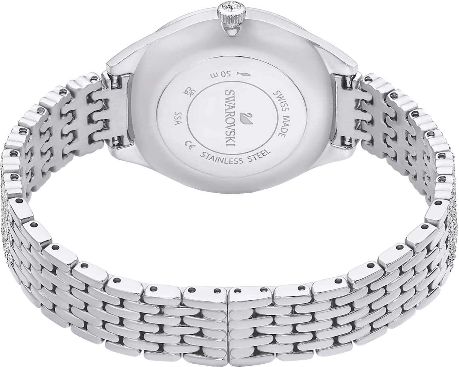 Часы Swarovski 5644062– это воплощение изысканного дизайна и функциональности, созданное для тех, кто ценит красоту и точность. Серебристый круглый корпус из нержавеющей стали оснащен безелемБезельВнешний ободок, закрепляющий стекло. В спортивных часах так называется поворотное кольцо с делениями на циферблате, выполняет роль таймера – замеряет отрезки времени на шкале. Неподвижный безель – элемент декора. Однонаправленно вращающийся безель на дайверских часах позволяет фиксировать моменты погружения и выныривания на поверхность., украшенным паве из тридцати мерцающих кристаллов. Под минеральным стекломМинеральное стеклоМинеральное стекло представляет собой искусственно выращенный минерал кварца. Такое стекло отличается особой устойчивостью к повреждениям и царапинам. Уступает по некоторым качествам сапфировому стеклу. открывается серебристый циферблат украшен гильошированным узором и кристаллами для индексных меток. Рифленая заводная головка украшена кристаллом круглой огранки. Стальной браслет с застежкой «бабочка»Застёжка "бабочка"Такой вид застёжки дополняется предохранителями, помогающими избежать случайного раскрытия браслета. Обладают изящным исполнением. , декорирован кристаллами Swarovski. Водозащита 50WR делает их устойчивыми к влаге, позволяя наслаждаться стильным аксессуаром в любых условиях.