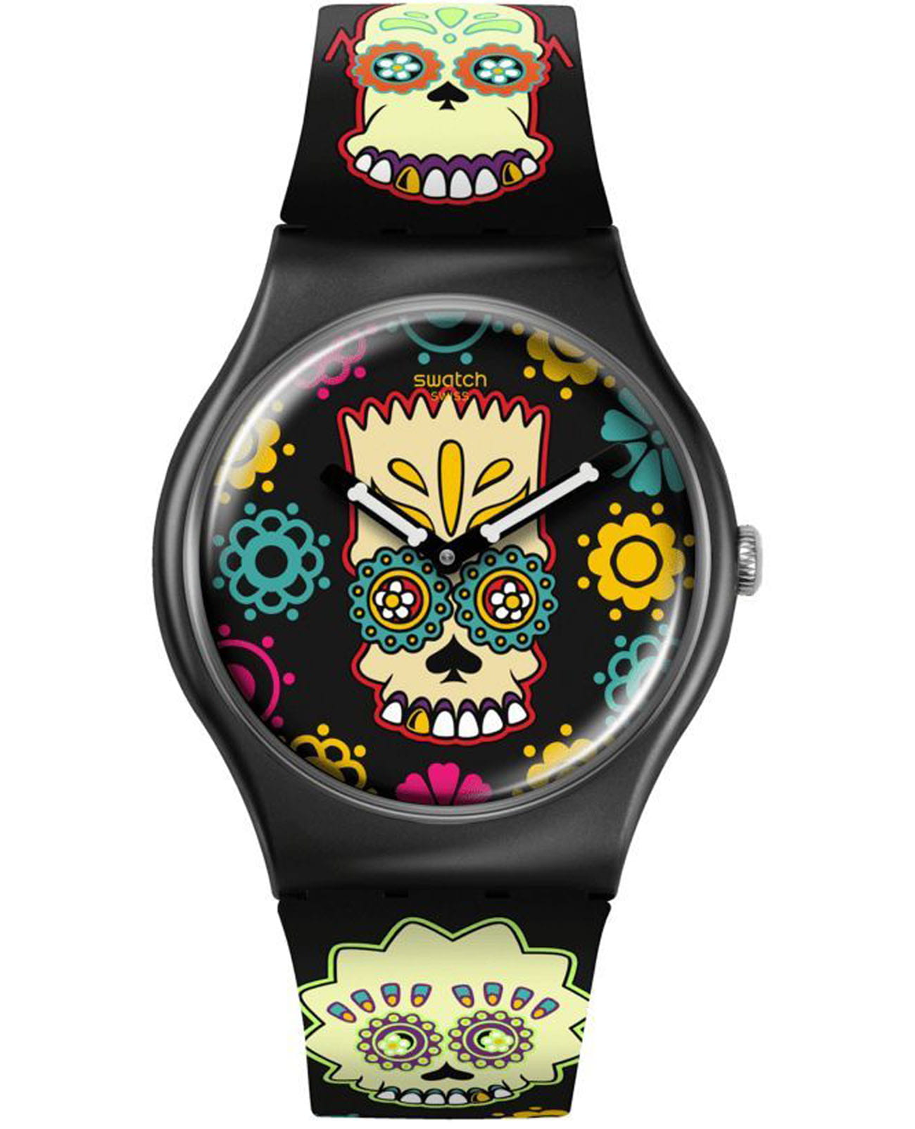 Часы Swatch SO29Z135 — эффектный и надежный аксессуар. Эти праздничные часы входят в коллекцию "Симпсоны" и изображают всю семью Симпсонов в масках на Хэллоуин. Изображения выполнены в многоцветной печати на матовом черном циферблате и ремешке. Черный циферблат украшен принтом и светящимися в темноте деталями, а также черными стрелками часов и минут с люминесцентным покрытиемЛюминесцентное покрытиеПозволяет считывать показания времени в темноте. Производители наносят на стрелки, часовые индексы, безель или поверхность циферблата светонакопительный состав, дающий холодное свечение. и белым принтом в форме костей. Логотип "Симпсоны" выполнен белым цветом на черной петле, а матовая черная пряжка завершает дизайн этих часов. Ремешок из силикона на стандартной застёжке. Внутри часов установлен надежный кварцевый механизм, который обеспечивает точность хода. Эти часы водонепроницаемы до 30 метров, что позволяет не беспокоиться о случайных брызгах или дождевых каплях. Swatch SO29Z135 — это идеальный выбор для тех, кто ценит сочетание стиля, комфорта и функциональности в одном аксессуаре.