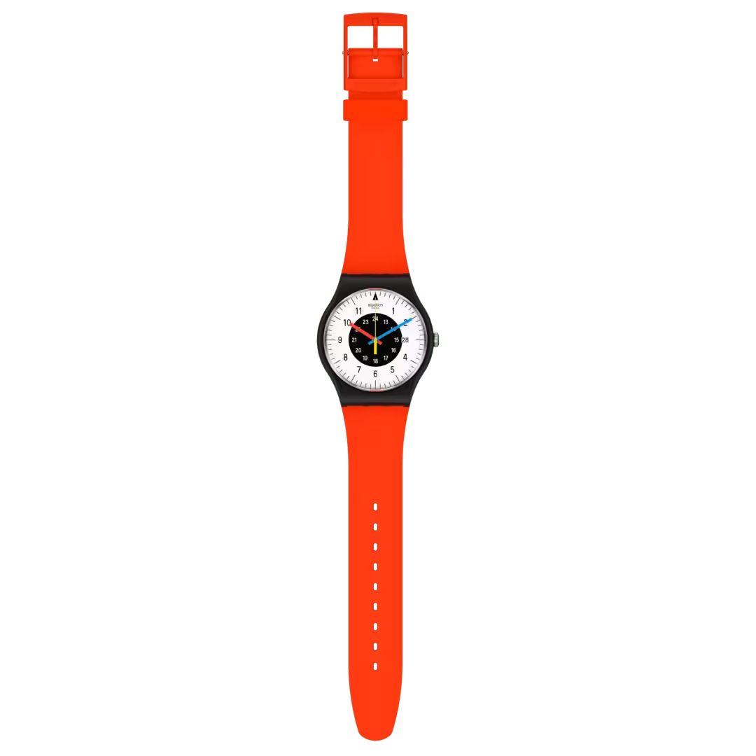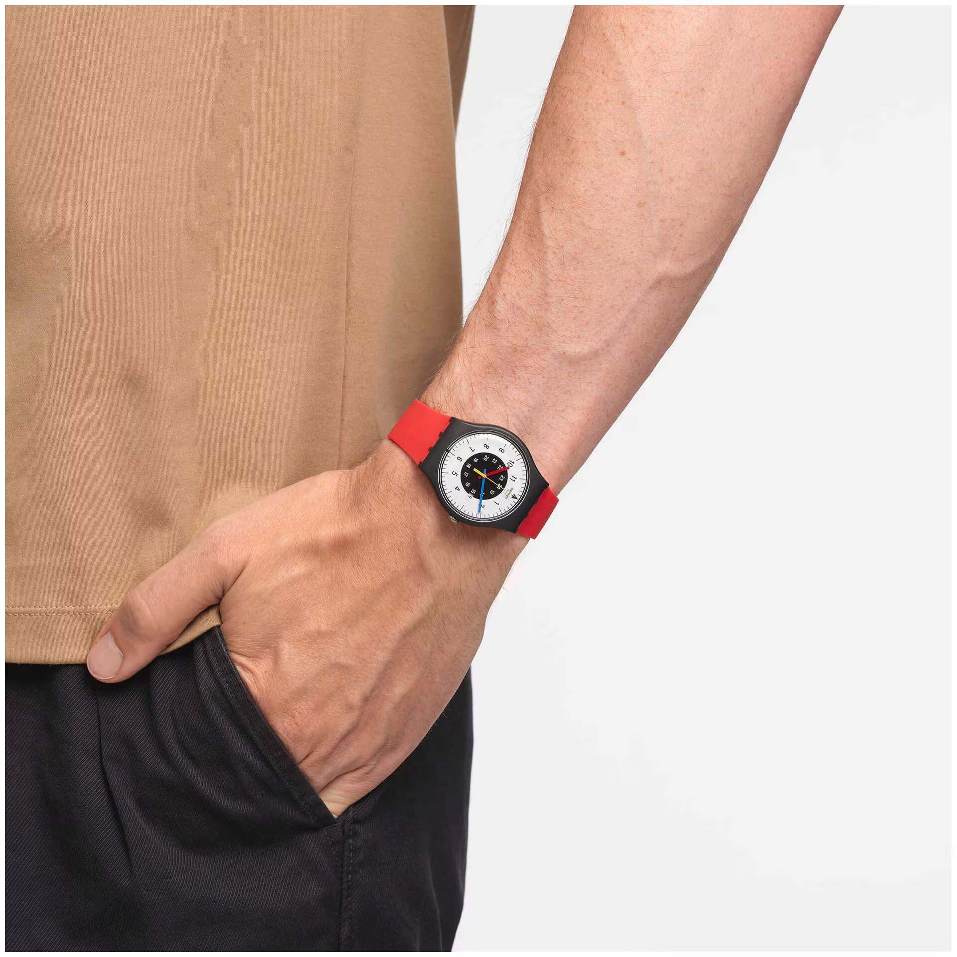 Swatch New Gent Bioceramic SO32B401 "Rouge & Noir" - стильные унисекс часы с матово-красным корпусом из инновационной биокерамики. Эта модель привлекает внимание белым циферблатом с черными принтами и разноцветными стрелками. Часы оснащены надежным швейцарским кварцевым механизмом и имеют водонепроницаемость 30 метров. Круглый корпус диаметром 41 мм и толщиной 10 мм удобно сидит на запястье. Красный ремешок из биопластика с рифленой текстурой обеспечивает комфорт при ношении. Модель оснащена выпуклым органическим стеклом для защиты циферблата. Эта модель Swiss Made сочетает в себе яркий дизайн и экологичность, что делает ее отличным выбором для современных людей, ценящих качество и стиль. "Rouge & Noir" является переизданием классической модели Swatch 1984 года, адаптированной под современные размеры и материалы.