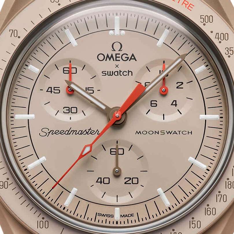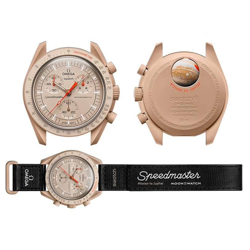 Часы Swatch Bioceramic Moonswatch MISSION TO JUPITER SO33C100 — это стильный и современный аксессуар для тех, кто ценит лёгкость и комфорт. Корпус диаметром 42 мм и пряжка этих уникальных часов изготовлены из биокерамикиБиокерамикаБиокерамика — это материал, который на две трети состоит из керамики, на одну треть — из биопластика. Он сочетает в себе лучшие качества обоих материалов и обладает прочностью и шелковистой на ощупь текстурой., а также ремешок VELCRO®. Модель оснащена бежевым циферблатом и биокерамическим безелемБезельВнешний ободок, закрепляющий стекло. В спортивных часах так называется поворотное кольцо с делениями на циферблате, выполняет роль таймера – замеряет отрезки времени на шкале. Неподвижный безель – элемент декора. Однонаправленно вращающийся безель на дайверских часах позволяет фиксировать моменты погружения и выныривания на поверхность. на который нанесена шкала тахиметраТахиметрРазмеченная шкала, располагается на ободке или безеле часов. Тахиметр позволяет рассчитать скорость на определённом участке пути, расстояние измеряется в километрах или милях.. Общими характеристиками всех часов в данной коллекции являются конструкция стекла из биоматериала, «скрытая» в центре кристалла буква "S", тонкий и изящный круговой узор на внешнем кольце циферблата и заглубленных мини-циферблатах, гладкие ушки с заостренными концами, культовая точка над отметкой 90 на тахиметрической шкале безеля и, конечно же, уникальный материал – биокерамика. Индексы, часовая, минутная и секундная стрелки хронографаХронографФункция позволяет измерять отрезки времени с особой точностью: часы, минуты, секунды. Верным признаком хронографа является наличие на циферблате 3 дополнительных окошек-счётчиков. покрыты люминесцентным покрытиемЛюминесцентное покрытиеПозволяет считывать показания времени в темноте. Производители наносят на стрелки, часовые индексы, безель или поверхность циферблата светонакопительный состав, дающий холодное свечение. Super-LumiNova® класса А, благодаря чему они светятся в темноте. Циферблаты каждых часов в данной коллекции украшены фирменным знаком OMEGA X Swatch, культовым логотипом Speedmaster и логотипом MoonSwatch.