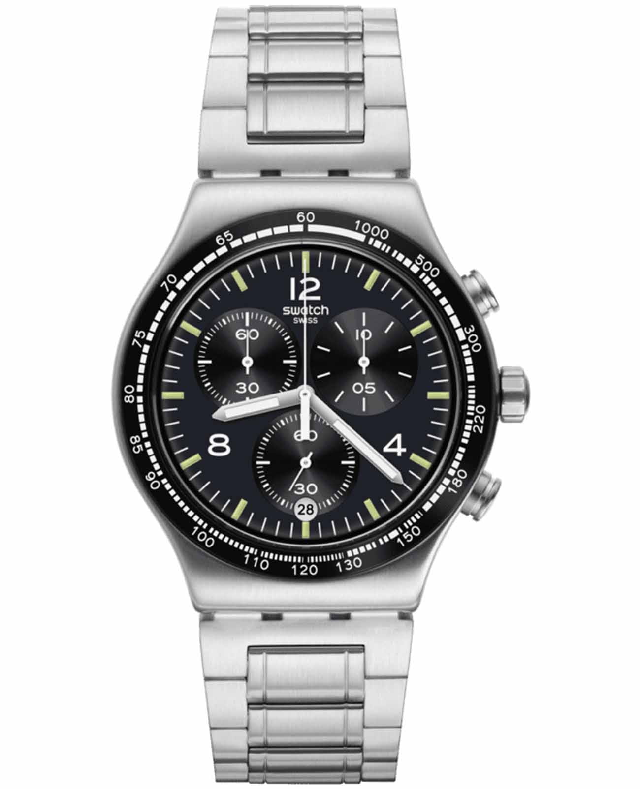 Часы Swatch YVS444GC — это стильный и современный аксессуар для тех, кто ценит лёгкость и комфорт. Этот стильный хронографХронографФункция позволяет измерять отрезки времени с особой точностью: часы, минуты, секунды. Верным признаком хронографа является наличие на циферблате 3 дополнительных окошек-счётчиков. революция стиля, ведь в ней изящно сочетаются спортивный дух и подчеркнутая элегантность. Эти часы оснащены черным циферблатом с радиальной полировкой и белым принтом, а также окошком даты в положении 6 часов и стрелками с люминесцентным покрытиемЛюминесцентное покрытиеПозволяет считывать показания времени в темноте. Производители наносят на стрелки, часовые индексы, безель или поверхность циферблата светонакопительный состав, дающий холодное свечение.. БезельБезельВнешний ободок, закрепляющий стекло. В спортивных часах так называется поворотное кольцо с делениями на циферблате, выполняет роль таймера – замеряет отрезки времени на шкале. Неподвижный безель – элемент декора. Однонаправленно вращающийся безель на дайверских часах позволяет фиксировать моменты погружения и выныривания на поверхность. из полированной стали с черным PVDPVDУльтратонкое покрытие наносится в технике вакуумного напыления, сочетает в себе нитрид титана особой прочности со слоем золота или оксида хрома. Несёт в себе декоративную или защитную функцию. покрытием имеет гравировку, выполненную белой эмалью, и помещен в корпус из полированной нержавеющей стали. Регулируемый браслет с раскладной застёжкойРаскладная застёжкаТакой тип застёжки используется только на браслетах из металла. Она никогда не раскрывается полностью, происходит разделение на 2 и более частей. Раскладывающая застёжка снизит вероятность потери часов к минимуму., напоминающий длинную черную гоночную трассу, изготовлен из нержавеющей стали. Водозащита 30 метров делает часы практичными для повседневного использования. Эти часы подойдут для повседневного ношения и станут ярким акцентом в вашем наряде.
