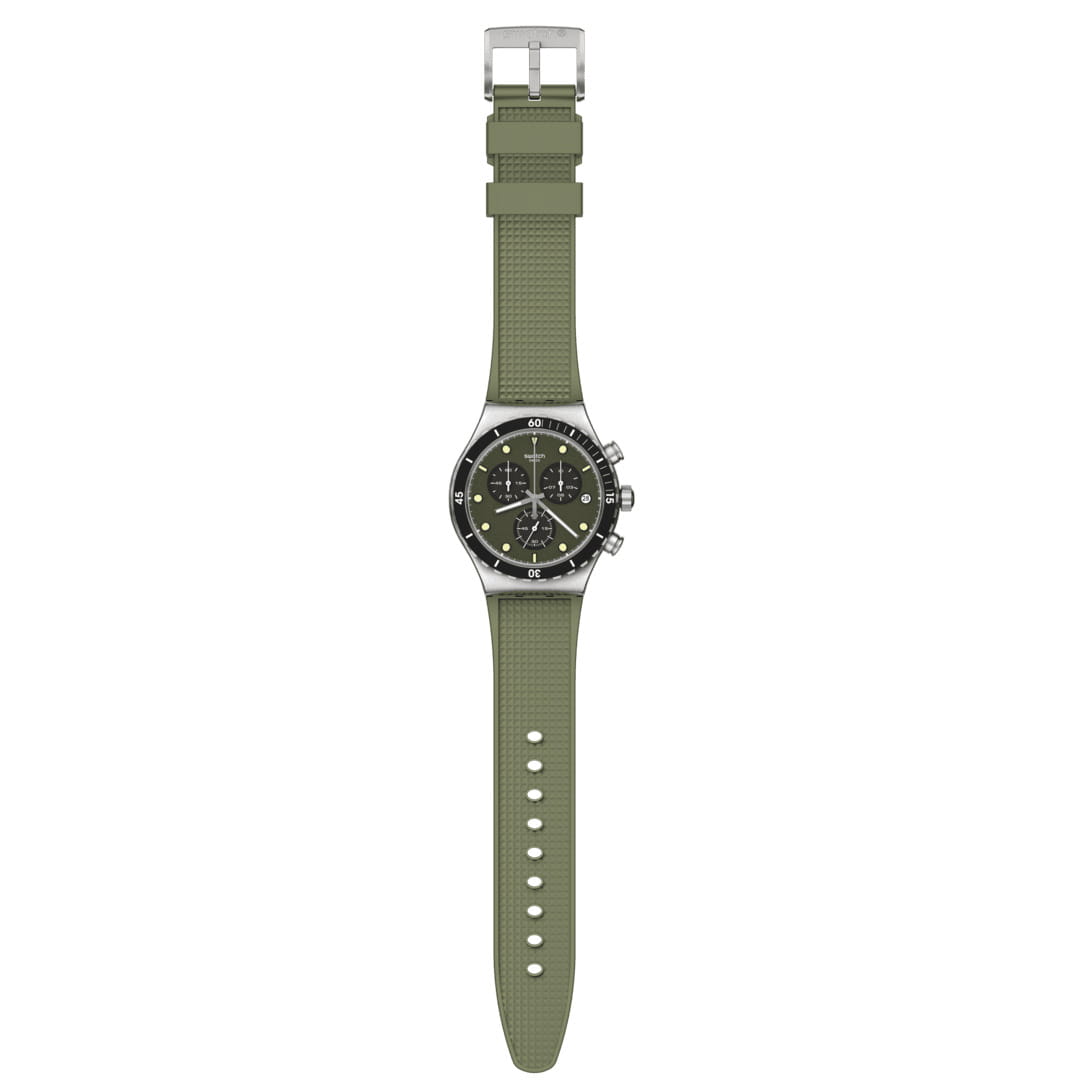 Часы Swatch YVS488 — это стильный и современный аксессуар для тех, кто ценит лёгкость и комфорт. Эта стильная модель часов из нержавеющей стали дополнена зеленым каучуковым ремешком с фактурным верхом и матовой застежкой из нержавеющей стали. Но изюминка этих часов — матовый зеленый циферблат с черными счетчиками хронографаХронографФункция позволяет измерять отрезки времени с особой точностью: часы, минуты, секунды. Верным признаком хронографа является наличие на циферблате 3 дополнительных окошек-счётчиков., индексами и стрелками с люминесцентным покрытиемЛюминесцентное покрытиеПозволяет считывать показания времени в темноте. Производители наносят на стрелки, часовые индексы, безель или поверхность циферблата светонакопительный состав, дающий холодное свечение.. Завершают образ индикатор даты в положении «3 часа» на циферблате, а также серебристые цифры и индексы на безелеБезельВнешний ободок, закрепляющий стекло. В спортивных часах так называется поворотное кольцо с делениями на циферблате, выполняет роль таймера – замеряет отрезки времени на шкале. Неподвижный безель – элемент декора. Однонаправленно вращающийся безель на дайверских часах позволяет фиксировать моменты погружения и выныривания на поверхность. из нержавеющей стали с черным PVDPVDУльтратонкое покрытие наносится в технике вакуумного напыления, сочетает в себе нитрид титана особой прочности со слоем золота или оксида хрома. Несёт в себе декоративную или защитную функцию. покрытием. Водозащита 30 метров делает часы практичными для повседневного использования. Эти часы подойдут для повседневного ношения и станут ярким акцентом в вашем наряде.