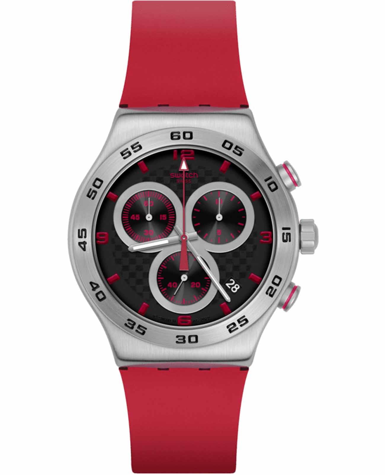 Часы Swatch YVS524 — это стильный и современный аксессуар для тех, кто ценит лёгкость и комфорт. Эти часы с хронографомХронографФункция позволяет измерять отрезки времени с особой точностью: часы, минуты, секунды. Верным признаком хронографа является наличие на циферблате 3 дополнительных окошек-счётчиков. из нержавеющей стали воплощают в себе утонченный стиль городского шика. Черный циферблат сочетает в себе уникальный эффект углеродного волокна и красный принт. Матированный корпус из нержавеющей стали и пряжка в сочетании с матово-красным каучуковым ремешком и тренчиком производят неизгладимое впечатление. На часовую, минутную и секундную стрелки нанесено люминесцентное покрытиеЛюминесцентное покрытиеПозволяет считывать показания времени в темноте. Производители наносят на стрелки, часовые индексы, безель или поверхность циферблата светонакопительный состав, дающий холодное свечение., которое светится в темноте, создавая необычное изображение. Водозащита 30 метров делает часы практичными для повседневного использования. Эти часы подойдут для повседневного ношения и станут ярким акцентом в вашем наряде.