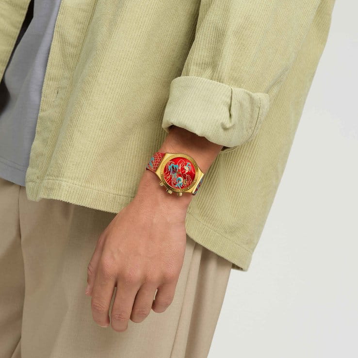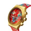 Часы Swatch YVZ100 — это стильный и современный аксессуар для тех, кто ценит лёгкость и комфорт. Этот красный хронографХронографФункция позволяет измерять отрезки времени с особой точностью: часы, минуты, секунды. Верным признаком хронографа является наличие на циферблате 3 дополнительных окошек-счётчиков. с блестящим золотым корпусом и безелемБезельВнешний ободок, закрепляющий стекло. В спортивных часах так называется поворотное кольцо с делениями на циферблате, выполняет роль таймера – замеряет отрезки времени на шкале. Неподвижный безель – элемент декора. Однонаправленно вращающийся безель на дайверских часах позволяет фиксировать моменты погружения и выныривания на поверхность. с PVDPVDУльтратонкое покрытие наносится в технике вакуумного напыления, сочетает в себе нитрид титана особой прочности со слоем золота или оксида хрома. Несёт в себе декоративную или защитную функцию. покрытием и такой же пряжкой на ремешке украшен изображением дракона. Цветной принт размещен как на циферблате с радиальной шлифовкой, так и на ремешке. На черные тренчики нанесены красная и золотистая надписи. На часовую и минутную стрелки нанесено люминесцентное покрытиеЛюминесцентное покрытиеПозволяет считывать показания времени в темноте. Производители наносят на стрелки, часовые индексы, безель или поверхность циферблата светонакопительный состав, дающий холодное свечение., которое светится в темноте, создавая необычное изображение. Водозащита 30 метров делает часы практичными для повседневного использования. Эти часы подойдут для повседневного ношения и станут ярким акцентом в вашем наряде.