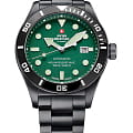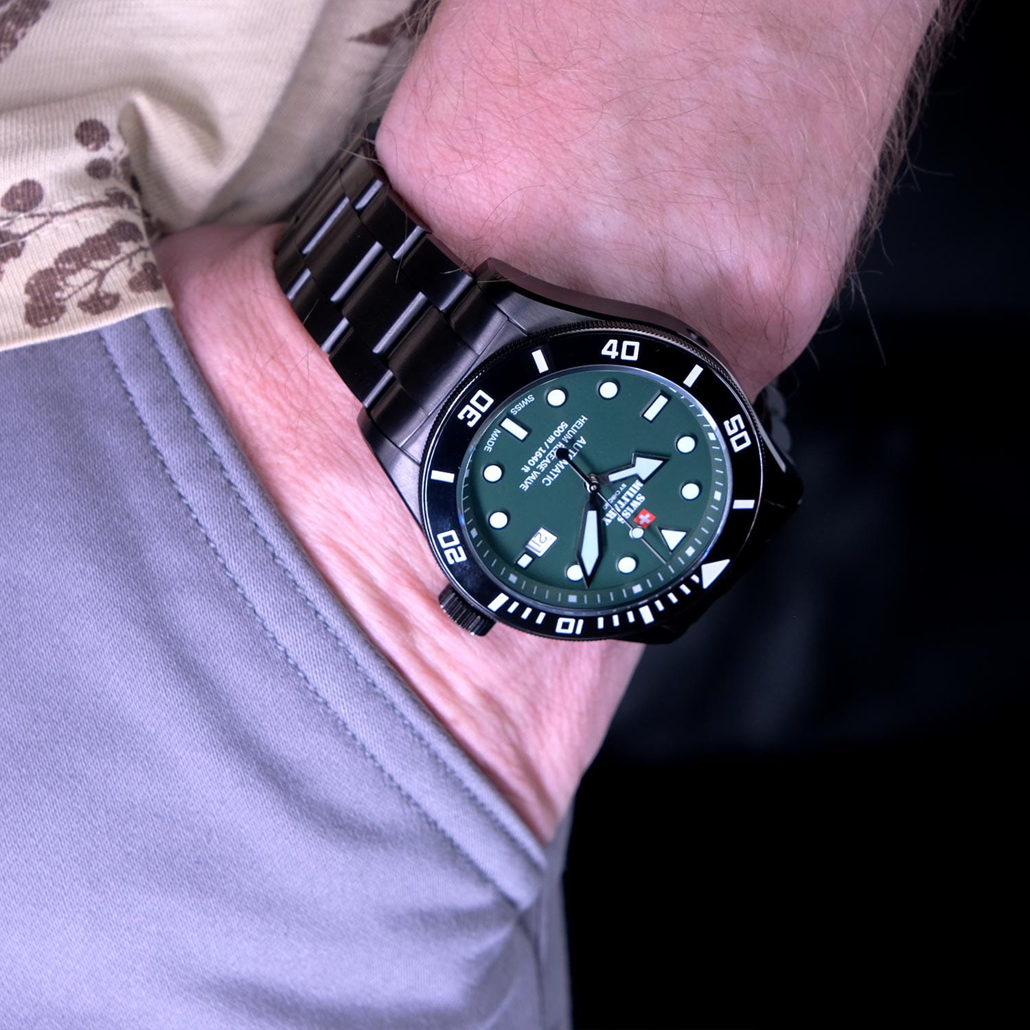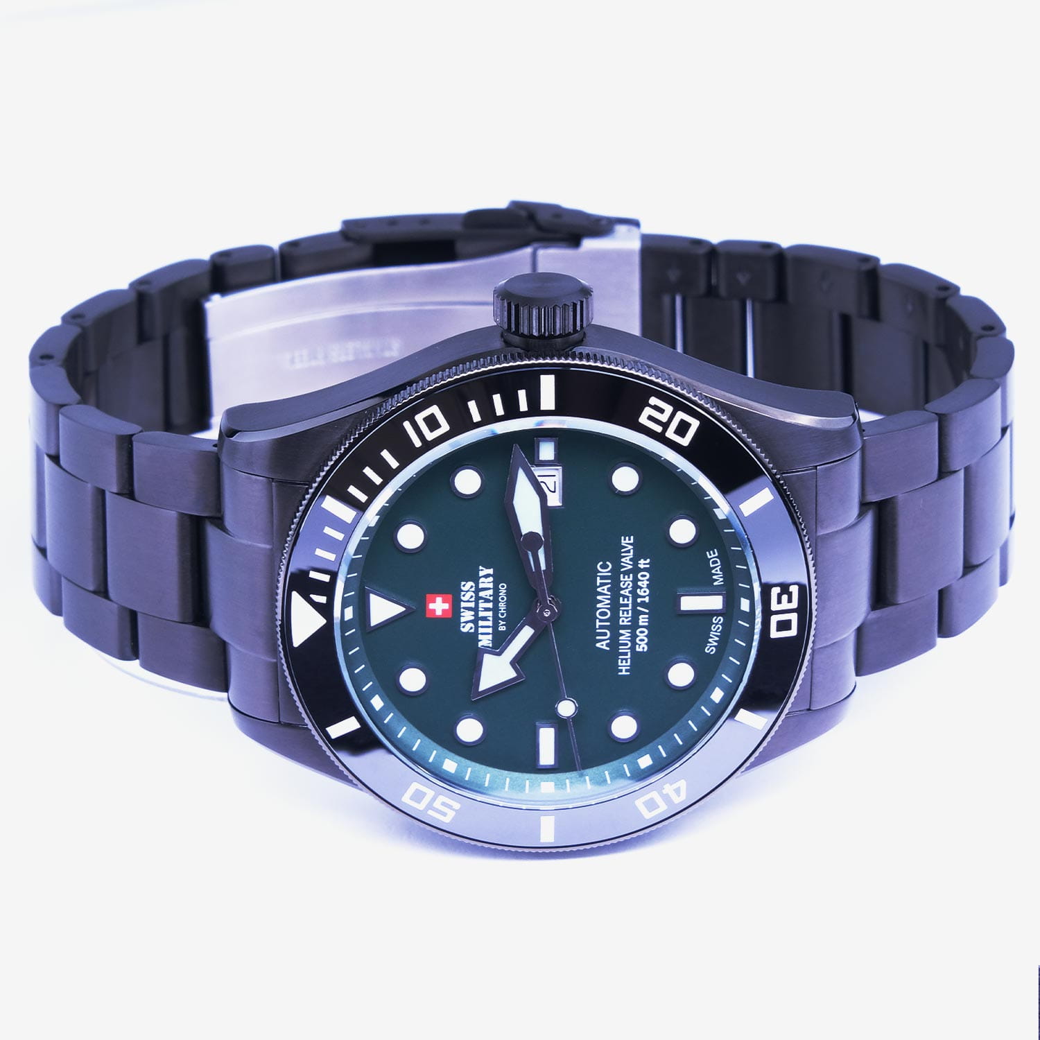 Мужские швейцарские механические часы с автоподзаводом Swiss Military by Chrono Diver SMA34075.08, механический механизм (автоматический калибр) с высокой точностью. Сапфировое стеклоСапфировое стеклоПрочный и надёжный материал из кристалла сапфира синтетического происхождения, характеризующийся особой твёрдостью и устойчивостью к царапинам и повреждениям. устойчивое к появлению царапин, обладающее высокой прозрачностью. Корпус часов изготовлен из стали с PVD-покрытиемPVDУльтратонкое покрытие наносится в технике вакуумного напыления, сочетает в себе нитрид титана особой прочности со слоем золота или оксида хрома. Несёт в себе декоративную или защитную функцию. матового черного цвета, который обрамляет керамический безельБезельВнешний ободок, закрепляющий стекло. В спортивных часах так называется поворотное кольцо с делениями на циферблате, выполняет роль таймера – замеряет отрезки времени на шкале. Неподвижный безель – элемент декора. Однонаправленно вращающийся безель на дайверских часах позволяет фиксировать моменты погружения и выныривания на поверхность.. На зеленом циферблате центральные часовая, минутная и секундная стрелки и апертура даты в позиции 3 часов. Стальной браслет с PVD-покрытиемPVDУльтратонкое покрытие наносится в технике вакуумного напыления, сочетает в себе нитрид титана особой прочности со слоем золота или оксида хрома. Несёт в себе декоративную или защитную функцию. матового черного цвета, раскладывающаяся застёжкаРаскладная застёжкаТакой тип застёжки используется только на браслетах из металла. Она никогда не раскрывается полностью, происходит разделение на 2 и более частей. Раскладывающая застёжка снизит вероятность потери часов к минимуму..