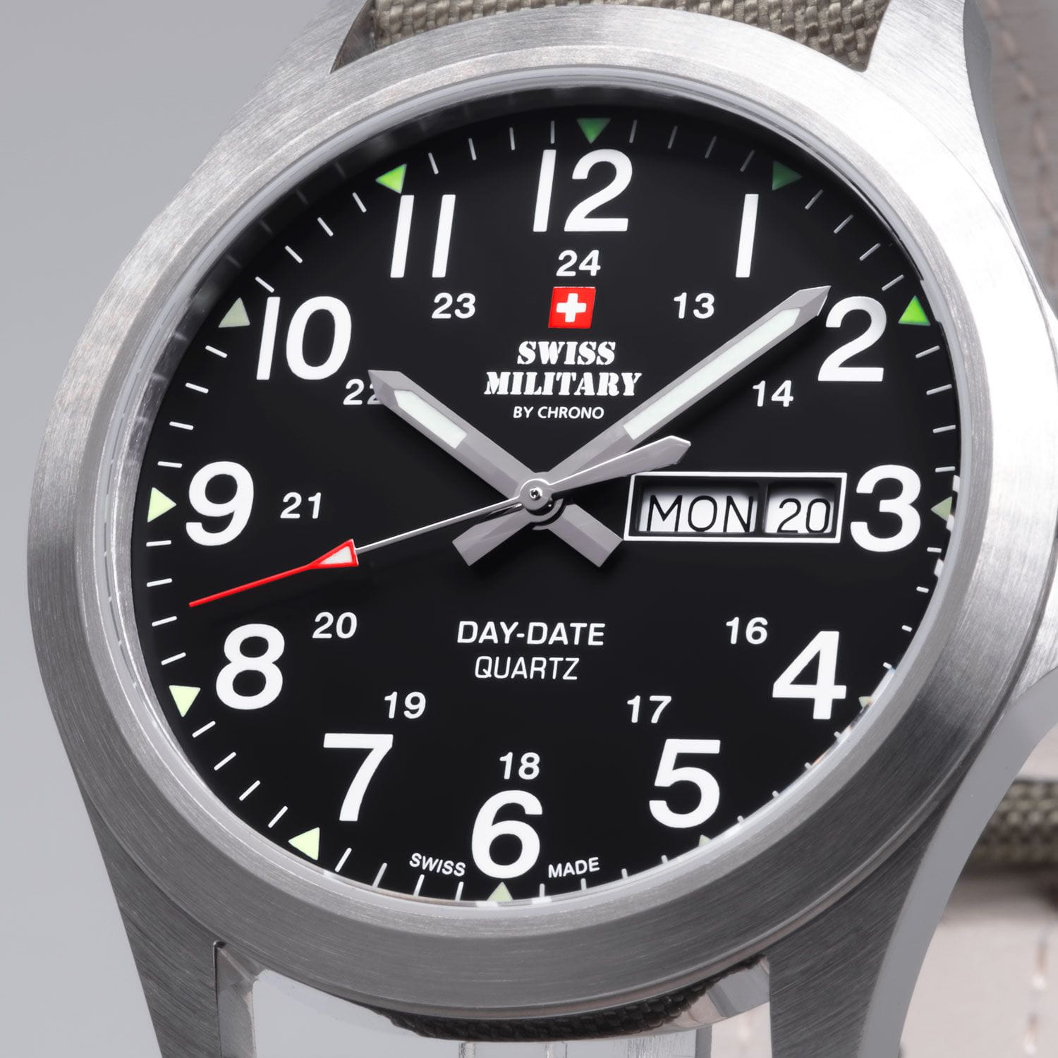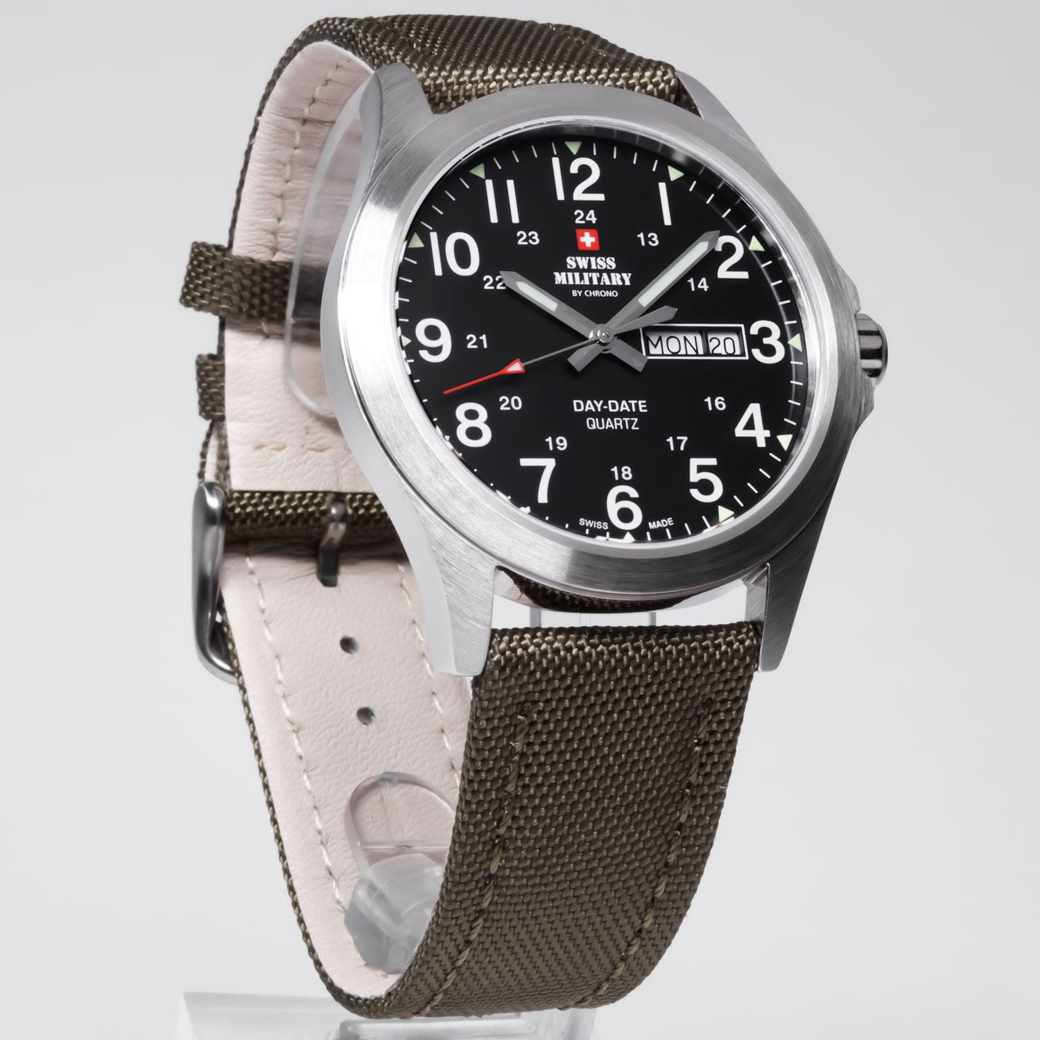 Мужские швейцарские наручные часы с минеральным стекломМинеральное стеклоМинеральное стекло представляет собой искусственно выращенный минерал кварца. Такое стекло отличается особой устойчивостью к повреждениям и царапинам. Уступает по некоторым качествам сапфировому стеклу. Swiss Military by Chrono Day Date SMP36040.05, кварцевый механизм с высокой точностью. Класс водозащиты: 50 метров, позволит защитить корпус от случайных брызг или капель дождя. Корпус часов изготовлен из стали. Стрелки и метки с люминесцентной подсветкойЛюминесцентное покрытиеПозволяет считывать показания времени в темноте. Производители наносят на стрелки, часовые индексы, безель или поверхность циферблата светонакопительный состав, дающий холодное свечение.. Заводная головка с защитой. Текстильный ремешок на стандартной застежке.