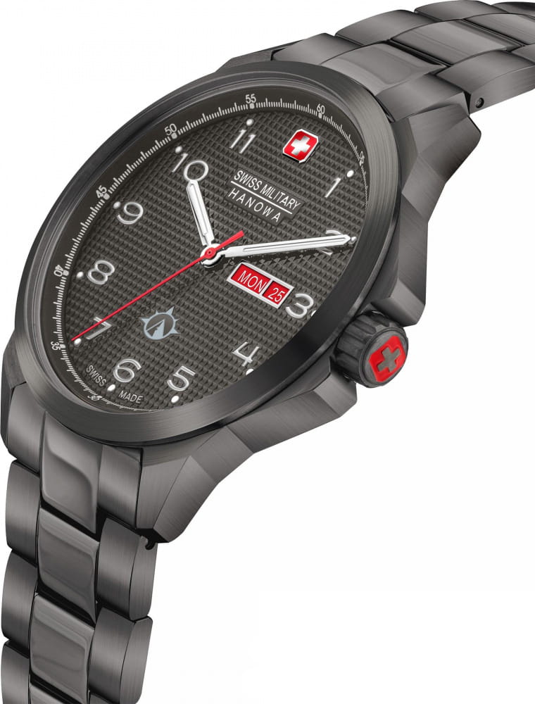 Швейцарские мужские часы Swiss Military Hanowa SMWGH2100341, кварцевый механизм с высокой точностью. Сапфировое стеклоСапфировое стеклоПрочный и надёжный материал из кристалла сапфира синтетического происхождения, характеризующийся особой твёрдостью и устойчивостью к царапинам и повреждениям. устойчивое к появлению царапин, обладающее высокой прозрачностью. Циферблат украшен декоративным узором Clous de Paris (Парижские гвозди). Часовая и минутная стрелки с люминесцентным покрытиемЛюминесцентное покрытиеПозволяет считывать показания времени в темноте. Производители наносят на стрелки, часовые индексы, безель или поверхность циферблата светонакопительный состав, дающий холодное свечение., которое светится в темноте после непродолжительной зарядки на свету. Класс водозащиты: 100 метров, позволит плавать, нырять и заниматься другими водными видами спорта. Корпус и браслет часов изготовлены из стали с IP-покрытиемIP-покрытиеМетод ионного напыления. Демонстрирует повышенную устойчивость к истиранию, окислению и химическим веществам. Под воздействием высокого давления и температуры около 1500°C молекулы металла надёжно соединяются с частицами корпуса часов. черного цвета. Окошки дня недели и даты находятся в положении 3 часа. Метки в виде арабских цифр, 12-ти часовая метка в виде фирменного логотипа. Рифленая заводная головка с защитой. Завинчивающаяся задняя крышка. Браслет с раскладной застёжкойРаскладная застёжкаТакой тип застёжки используется только на браслетах из металла. Она никогда не раскрывается полностью, происходит разделение на 2 и более частей. Раскладывающая застёжка снизит вероятность потери часов к минимуму.. Застежка с системой блокировки.