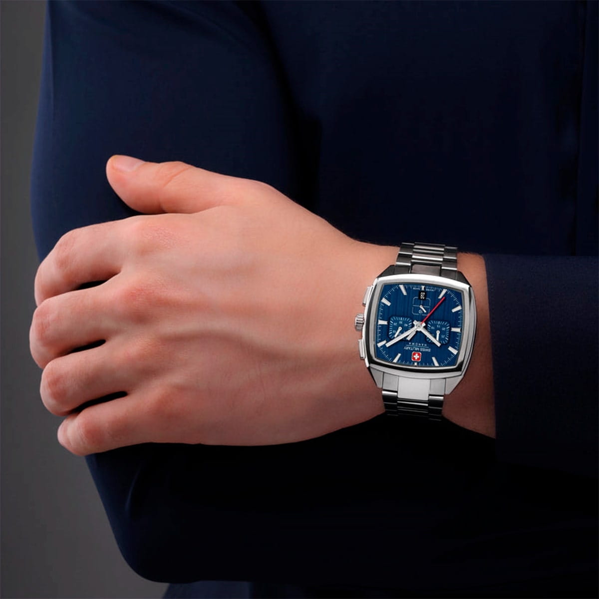 Часы Swiss Military Hanowa Starlight Chrono SMWGI0004302 сочетают современный дизайн с высокой функциональностью. Квадратный корпус диаметром 40 мм выполнен из нержавеющей стали, а синий циферблат защищён сапфировым стекломСапфировое стеклоПрочный и надёжный материал из кристалла сапфира синтетического происхождения, характеризующийся особой твёрдостью и устойчивостью к царапинам и повреждениям., устойчивым к царапинам.