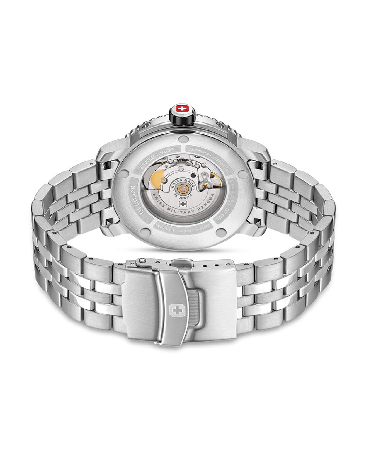 Swiss Military Hanowa Maitre Plongeur Automatic SMWGL0002002 — профессиональные часы для дайвинга с швейцарской точностью и надёжной конструкцией. Корпус диаметром 44 мм выполнен из нержавеющей стали, что обеспечивает прочность и долговечность. Однонаправленный вращающийся безельБезельВнешний ободок, закрепляющий стекло. В спортивных часах так называется поворотное кольцо с делениями на циферблате, выполняет роль таймера – замеряет отрезки времени на шкале. Неподвижный безель – элемент декора. Однонаправленно вращающийся безель на дайверских часах позволяет фиксировать моменты погружения и выныривания на поверхность. с керамической вставкой позволяет точно отслеживать время погружения. Синий циферблат украшен накладными часовыми индексами и стрелками с люминесцентным покрытиемЛюминесцентное покрытиеПозволяет считывать показания времени в темноте. Производители наносят на стрелки, часовые индексы, безель или поверхность циферблата светонакопительный состав, дающий холодное свечение., что гарантирует превосходную читаемость даже в темноте. Окошко даты расположено на отметке «6 часов». Защиту циферблата обеспечивает сапфировое стеклоСапфировое стеклоПрочный и надёжный материал из кристалла сапфира синтетического происхождения, характеризующийся особой твёрдостью и устойчивостью к царапинам и повреждениям., устойчивое к царапинам. Внутри установлен швейцарский автоматический механизм Soprod P024 с запасом хода до 38 часов, обеспечивающий надёжность и точность хода. Часы укомплектованы браслетом из нержавеющей стали, а раскладная застёжкаРаскладная застёжкаТакой тип застёжки используется только на браслетах из металла. Она никогда не раскрывается полностью, происходит разделение на 2 и более частей. Раскладывающая застёжка снизит вероятность потери часов к минимуму. гарантирует комфортную и надёжную фиксацию на запястье. В комплекте также предусмотрен сменный силиконовый ремешок. Водонепроницаемость 1000 метров делает модель идеальным выбором для глубоководного дайвинга. Автоматический гелиевый клапан обеспечивает безопасное выравнивание давления при всплытии.