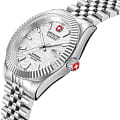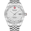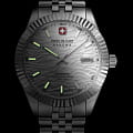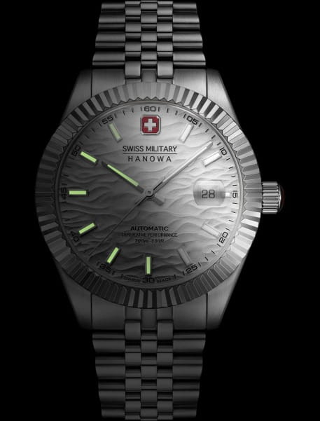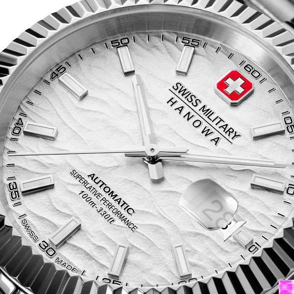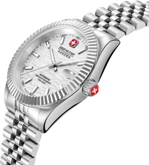 Часы Swiss Military Hanowa Master Diligenter SMWGL0005402 — это образец швейцарской точности и изысканного стиля. Эти механические часы с автоподзаводом оснащены калибром Soprod P024, который обеспечивает надежную работу механизма. Запас хода составляет 38 часов, что гарантирует их бесперебойное функционирование. Элегантный корпус диаметром 41 мм и толщиной 11 мм выполнен из прочной стали и украшен рифленым безелемБезельВнешний ободок, закрепляющий стекло. В спортивных часах так называется поворотное кольцо с делениями на циферблате, выполняет роль таймера – замеряет отрезки времени на шкале. Неподвижный безель – элемент декора. Однонаправленно вращающийся безель на дайверских часах позволяет фиксировать моменты погружения и выныривания на поверхность.. Серебристый текстурированный циферблат защищен сапфировым стекломСапфировое стеклоПрочный и надёжный материал из кристалла сапфира синтетического происхождения, характеризующийся особой твёрдостью и устойчивостью к царапинам и повреждениям., которое устойчиво к царапинам и сохраняет безупречный вид. Метки в виде штрихов и стрелки имеют люминесцентное покрытиеЛюминесцентное покрытиеПозволяет считывать показания времени в темноте. Производители наносят на стрелки, часовые индексы, безель или поверхность циферблата светонакопительный состав, дающий холодное свечение., которое обеспечивает видимость в темноте после кратковременной зарядки на свету. Окошко даты с увеличительным стеклом расположено в положении 3 часа, а фирменный логотип Swiss Military Hanowa находится в позиции 12 часов. Заводная головка с рифлением украшена фирменным логотипом, добавляя часам изысканный акцент. Прозрачная задняя крышка позволяет наблюдать за работой механизма, подчеркивая внимание к деталям. Завершает образ стальной браслет с раскладной застёжкойРаскладная застёжкаТакой тип застёжки используется только на браслетах из металла. Она никогда не раскрывается полностью, происходит разделение на 2 и более частей. Раскладывающая застёжка снизит вероятность потери часов к минимуму., который удобно сидит на запястье и обеспечивает надежную фиксацию. Часы обладают водозащитой уровня 100WR, что делает их подходящими для повседневного использования и активного образа жизни.