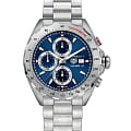 44-миллиметровый спортивный хронограф с переливающимся синим циферблатом, синими и серебряными вспомогательными циферблатами, матовым и полированным корпусом из нержавеющей стали. Неподвижный стальной безель с тахиметрической шкалой для преобразования расстояния в скорость. Мужские часы с хронографом TAG Heuer Formula 1 CAZ2015.BA0876, механический механизм (автоматический калибр) с высокой точностью. Сапфировое стекло устойчивое к появлению царапин, обладающее высокой прозрачностью. Класс водозащиты: 200 метров, позволит плавать, нырять и заниматься другими водными видами спорта. Корпус часов изготовлен из стали, серебристого цвета.
