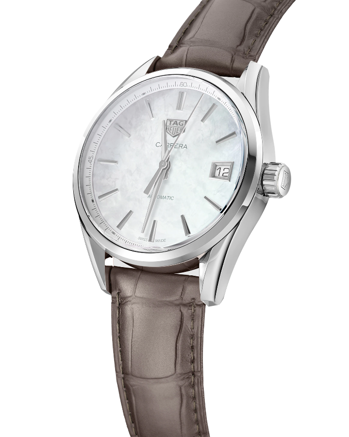 В этих элегантных часах TAG Heuer Carrera Lady с полированным корпусом из нержавеющей стали и перламутровым циферблатом установлен автоматический механизм Calibre 5. Его запас хода составляет 38 часов. TAG Heuer Carrera Lady WBK2311.FC8258, механический механизм (автоматический калибр) с высокой точностью. Сапфировое стекло устойчивое к появлению царапин, обладающее высокой прозрачностью. Класс водозащиты: 100 метров, позволит плавать, нырять и заниматься другими водными видами спорта. Корпус часов изготовлен из стали, серебристого цвета.