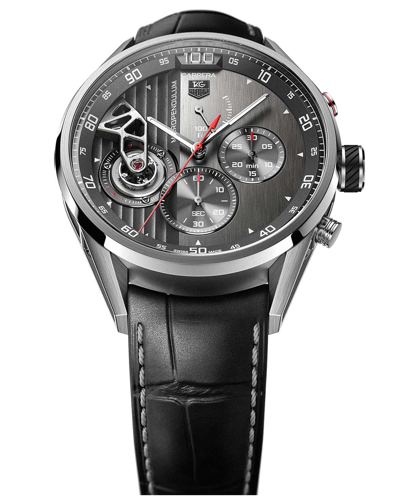 Механические мужские  швейцарские часы-хронограф TAG Heuer Carrera CAR2B82.FC6339. TAG Heuer Carrera MikroPendulum - это новый этап эволюции платформы Mikro - семейства механизмов, быстро завоевавших репутацию одних из самых радикальных и инновационных калибров, предлагаемых современными часовыми мастерами. Это уникальный хронографХронографФункция позволяет измерять отрезки времени с особой точностью: часы, минуты, секунды. Верным признаком хронографа является наличие на циферблате 3 дополнительных окошек-счётчиков., способный стать вашим любимым аксессуаром, который несомненно подчеркнет ваш статус. Часы с магнитным маятниковым хронографом и секундомеромСекундомерСекундоме́р — прибор, способный измерять интервалы времени с точностью до долей секунды. с точностью до 1/100 секунды и запасом автономного хода в 70 минут. Циферблат с люминесцентным покрытиемЛюминесцентное покрытиеПозволяет считывать показания времени в темноте. Производители наносят на стрелки, часовые индексы, безель или поверхность циферблата светонакопительный состав, дающий холодное свечение. стрелок. Титановый корпус с сочетанием пескоструйной обработки, матирования и полировки. В механизме 58 камней, 371 деталь, частота 28800 полуколебаний в час. Запас хода для часов - 42 часа, для хронографа - 90 минут. Ретроградный указатель запаса хода в позиции 12 часов. Центральная красная стрелка отсчитывает сотые доли секунды, шкала которых расположена на внутреннем безеле. Циферблат антрацитового цвета состоит из двух частей: одна часть с матовой отделкой, вторая - с узором Cotes de Geneve. Прозрачная задняя крышка с сапфировым стеклом. Ремешок из кожи аллигатора с раскладывающейся застежкой.