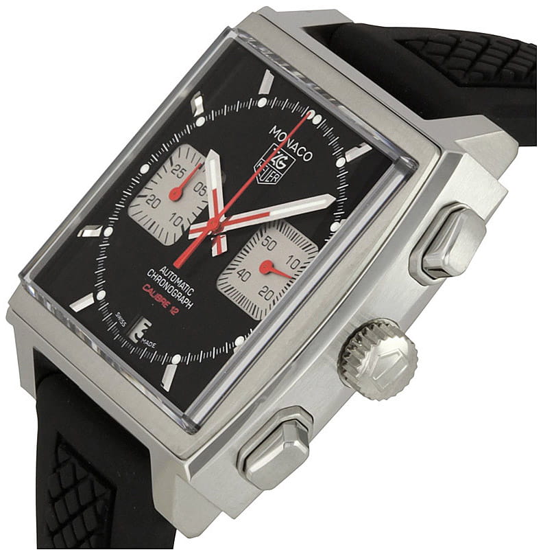 Часы TAG Heuer Monaco CAW2114.FT6021 — это стильное сочетание современного дизайна и часового мастерства. Корпус из нержавеющей стали диаметром 39 мм защищён сапфировым стекломСапфировое стеклоПрочный и надёжный материал из кристалла сапфира синтетического происхождения, характеризующийся особой твёрдостью и устойчивостью к царапинам и повреждениям., что обеспечивает отличную видимость и защиту от царапин. Черный циферблат с хронографомХронографФункция позволяет измерять отрезки времени с особой точностью: часы, минуты, секунды. Верным признаком хронографа является наличие на циферблате 3 дополнительных окошек-счётчиков. и секундомеромСекундомерСекундоме́р — прибор, способный измерять интервалы времени с точностью до долей секунды.. Люминесцентные стрелки и меткиЛюминесцентное покрытиеПозволяет считывать показания времени в темноте. Производители наносят на стрелки, часовые индексы, безель или поверхность циферблата светонакопительный состав, дающий холодное свечение. обеспечивают превосходную читаемость даже в условиях низкой освещённости. Эти элегантные часы с калибром Calibre 12, который обеспечивает точность хода. Браслет из каучука оснащён раскладной застёжкойРаскладная застёжкаТакой тип застёжки используется только на браслетах из металла. Она никогда не раскрывается полностью, происходит разделение на 2 и более частей. Раскладывающая застёжка снизит вероятность потери часов к минимуму. с кнопкой, что обеспечивает удобство и надёжность. Водонепроницаемость до 100 метров делает часы подходящими для плавания и активного использования. TAG Heuer Monaco CAW2114.FT6021 — это выбор для тех, кто ценит утончённость, стиль и высочайшее качество.
