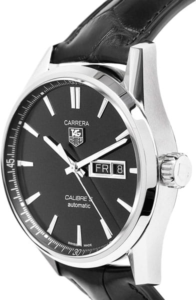 Элегантные часы TAG Heuer Carrera Calibre 5 Automatic Mens Black Leather Watch созданы для мужчин, которые ценят сдержанность и спортивный шик. Надежный и точный механизм Calibre 5 обладает запасом хода 38 часа. Узнаваемые вытянутые ушки стального корпуса, разметка, вынесенная на скошенный ободок циферблата, и архитектурный дизайн делают эту модель превосходным образцом элегантного стиля. Черный циферблат украшен объемным узором в виде расходящихся из центра концентрических кругов, что добавляет глубины и красивых переливов цвета. Часы оснащены не только функцией даты, но и дня недели, дополнительное окошко которого разместилось рядом с апертурой даты напротив отметки "3 часа". Черный ремешок из кожи аллигатора обеспечивает эргономичную посадку часов, а прочное сапфировое стекло защитит от царапин.