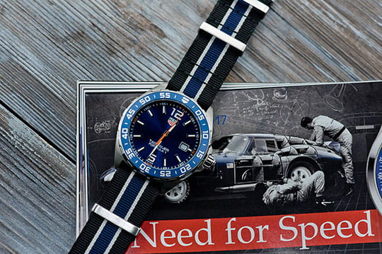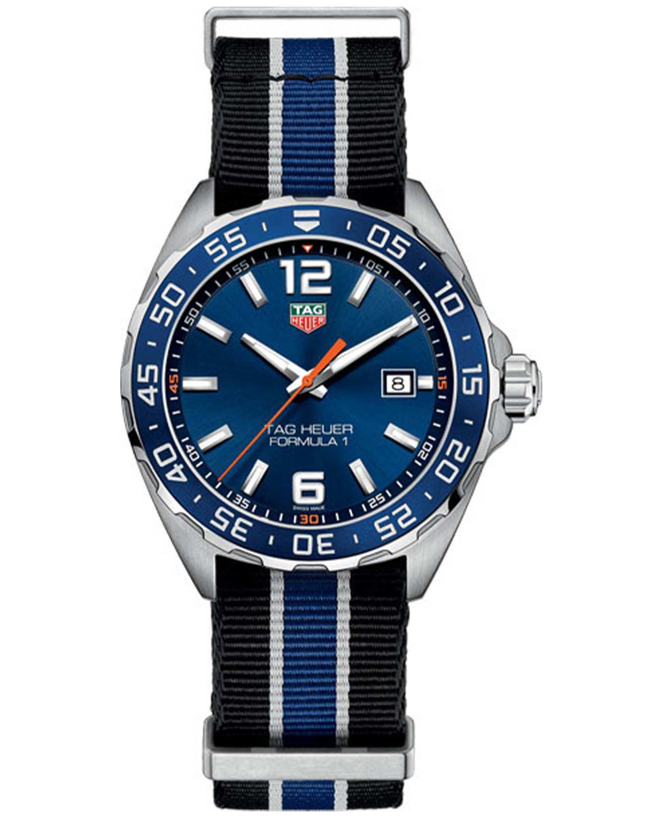 Мужские швейцарские наручные кварцевые часы TAG Heuer Formula 1 WAZ1010.FC8197. Сапфировое стеклоСапфировое стеклоПрочный и надёжный материал из кристалла сапфира синтетического происхождения, характеризующийся особой твёрдостью и устойчивостью к царапинам и повреждениям. устойчивое к появлению царапин, обладающее высокой прозрачностью. Стрелки и метки с люминесцентным покрытиемЛюминесцентное покрытиеПозволяет считывать показания времени в темноте. Производители наносят на стрелки, часовые индексы, безель или поверхность циферблата светонакопительный состав, дающий холодное свечение.. Класс водозащиты: 200 метров, позволит плавать, нырять и заниматься другими водными видами спорта. Корпус часов изготовлен из стали. Вращающийся стальной безельБезельВнешний ободок, закрепляющий стекло. В спортивных часах так называется поворотное кольцо с делениями на циферблате, выполняет роль таймера – замеряет отрезки времени на шкале. Неподвижный безель – элемент декора. Однонаправленно вращающийся безель на дайверских часах позволяет фиксировать моменты погружения и выныривания на поверхность. с PVD-покрытиемPVDУльтратонкое покрытие наносится в технике вакуумного напыления, сочетает в себе нитрид титана особой прочности со слоем золота или оксида хрома. Несёт в себе декоративную или защитную функцию.. Тканевый ремешок на стандартной застёжке. Окошко даты находится в положении 3 часа.