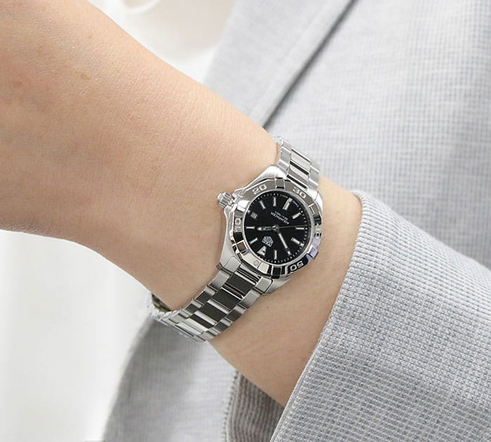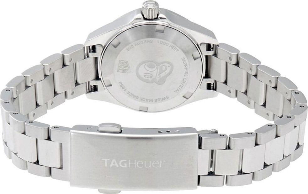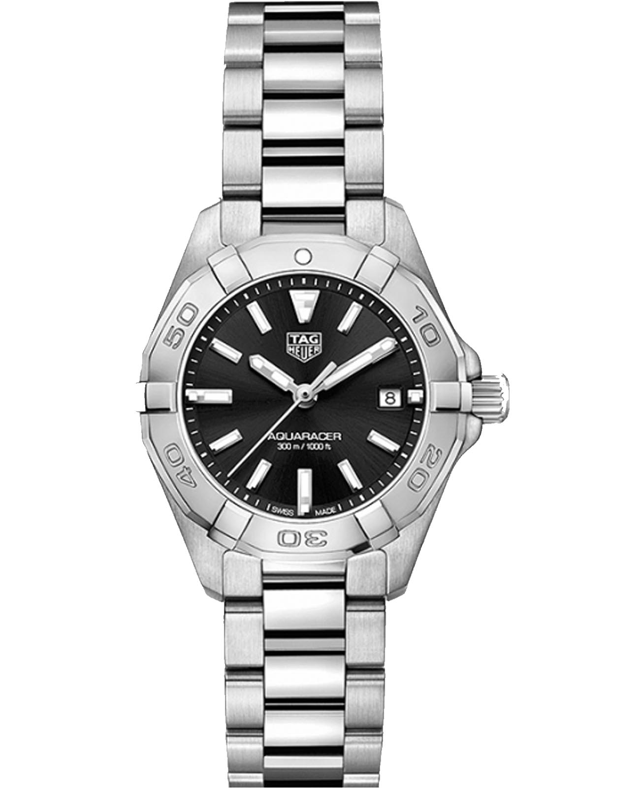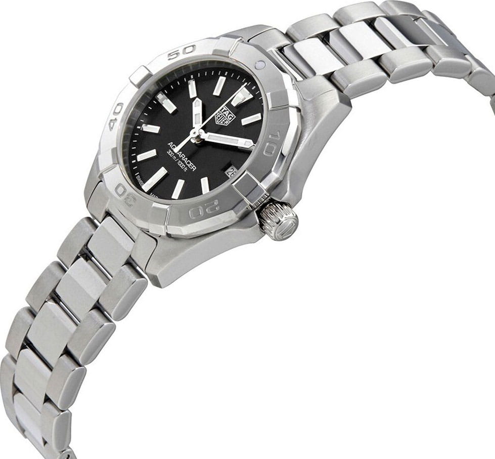 Изысканные кварцевые женские часы TAG Heuer Aquaracer  WBD1410.BA0741 с большим, выразительным корпусом диаметром 27 мм из нержавеющей стали. Кварцевый механизм с высокой точностью. Сапфировое стеклоСапфировое стеклоПрочный и надёжный материал из кристалла сапфира синтетического происхождения, характеризующийся особой твёрдостью и устойчивостью к царапинам и повреждениям. устойчивое к появлению царапин, обладающее высокой прозрачностью. Класс водозащиты: 300 метров, позволит плавать, нырять и заниматься другими водными видами спорта. Корпус часов изготовлен из стали, серебристого цвета. Стрелки с люминесцентным покрытиемЛюминесцентное покрытиеПозволяет считывать показания времени в темноте. Производители наносят на стрелки, часовые индексы, безель или поверхность циферблата светонакопительный состав, дающий холодное свечение.. Стальной браслет на раскладной застёжкеРаскладная застёжкаТакой тип застёжки используется только на браслетах из металла. Она никогда не раскрывается полностью, происходит разделение на 2 и более частей. Раскладывающая застёжка снизит вероятность потери часов к минимуму..