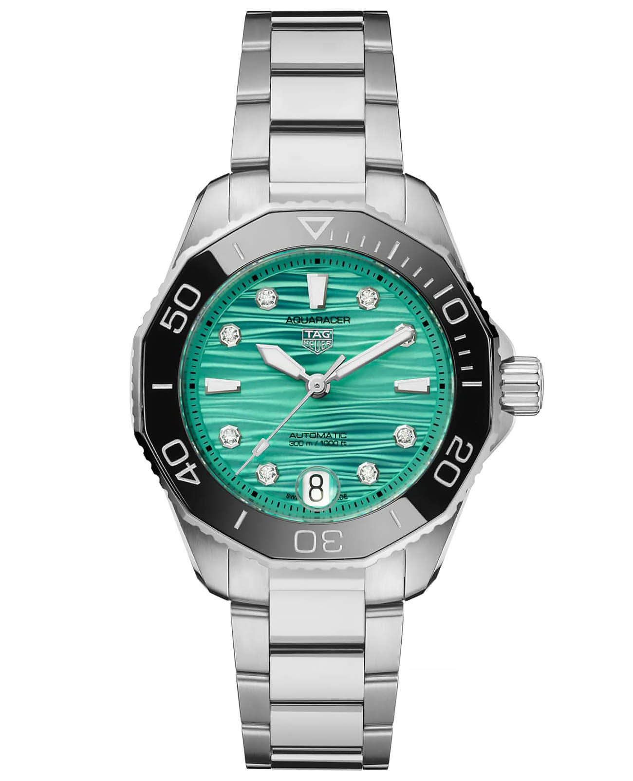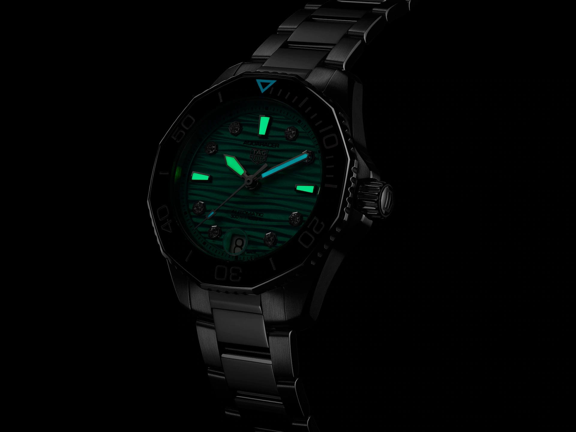 Яркий бирюзовый цвет циферблата, напоминающий об безмятежных лагунах, создает атмосферу для профессионального 300-метрового водонепроницаемого TAG Heuer Aquaracer. Разработанный для того, чтобы выдерживать экстремальное давление, этот дайвер готов к погружению....