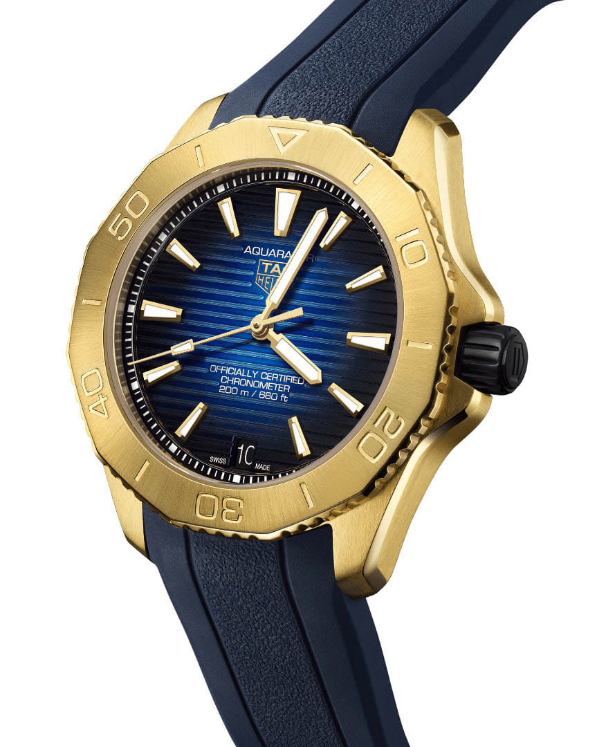 Изящный корпус этой модели TAG Heuer Aquaracer, выполненный из цельного желтого 18-каратного золото18-каратное золотоОбозначение по каратной системе пробирования, оно показывает, сколько драгоценного металла содержится в изделии. 18 карат - в составе 75% чистого золота, соответствует 750 пробе.