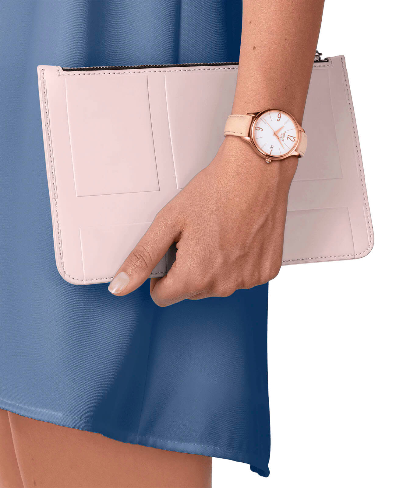 Минималистичный циферблат с PVD-покрытиемPVDУльтратонкое покрытие наносится в технике вакуумного напыления, сочетает в себе нитрид титана особой прочности со слоем золота или оксида хрома. Несёт в себе декоративную или защитную функцию. цвета розового золота станет лучшим решением для дополнения классического или вечернего образа. Дизайнерская модель имеет ремешок из натуральной кожи кремового оттенка, также в комплектацию входит 2 вариант в сером цвете. Кварцевый механизм ETA F06.111 с высокой точностью хода. Надёжное сапфировое стекло. Функция EOLEOLПредставляет собой систему, уведомляющую владельца часов о необходимости замены элемента питания. За 2 недели до полного разряда батарейки секундная стрелка перестаёт ходить чётко и начинает перепрыгивать на 3-4 деления., отображение текущего числа. Габариты: 38 x 38 x 7,1 мм.