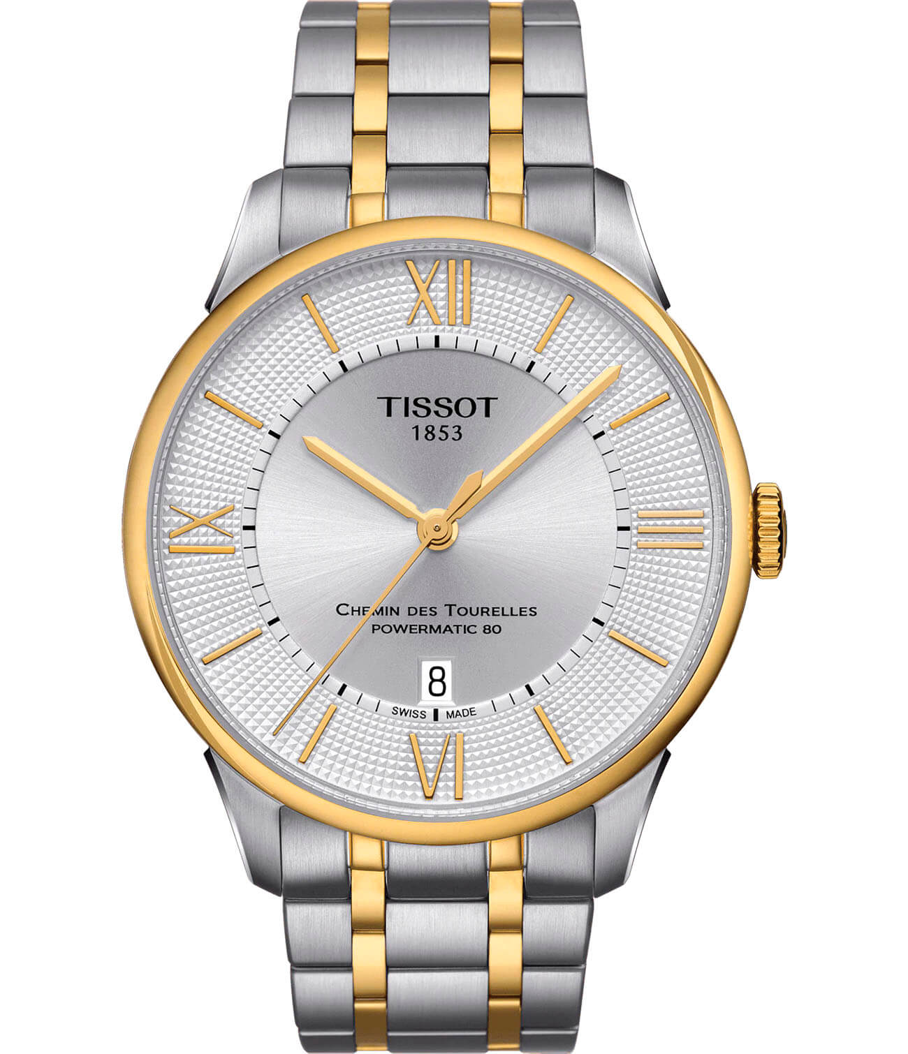 Модель с фирменным узором на циферблате сочетает серебряный и золотистый цвет, последний из которых образован слоем PVD-покрытияPVDУльтратонкое покрытие наносится в технике вакуумного напыления, сочетает в себе нитрид титана особой прочности со слоем золота или оксида хрома. Несёт в себе декоративную или защитную функцию.. Наручные часы выполнены в классическом стиле, они являются отражением лучших традиций Tissot. Элегантное исполнение. Автоматический механизм Powermatic 80Powermatic 80Эксклюзивный калибр от швейцарской компании ETA с увеличенным запасом хода до 80 часов за счёт удлинённой заводной пружины. Характеризуется улучшенной системой спуска со сниженным трением. с увеличенным запасом хода 80 часов. Прозрачная задняя крышка корпуса. Класс водостойкости WR 50. Апертура даты. Габариты: 42 x 42 x 10,9 мм.
