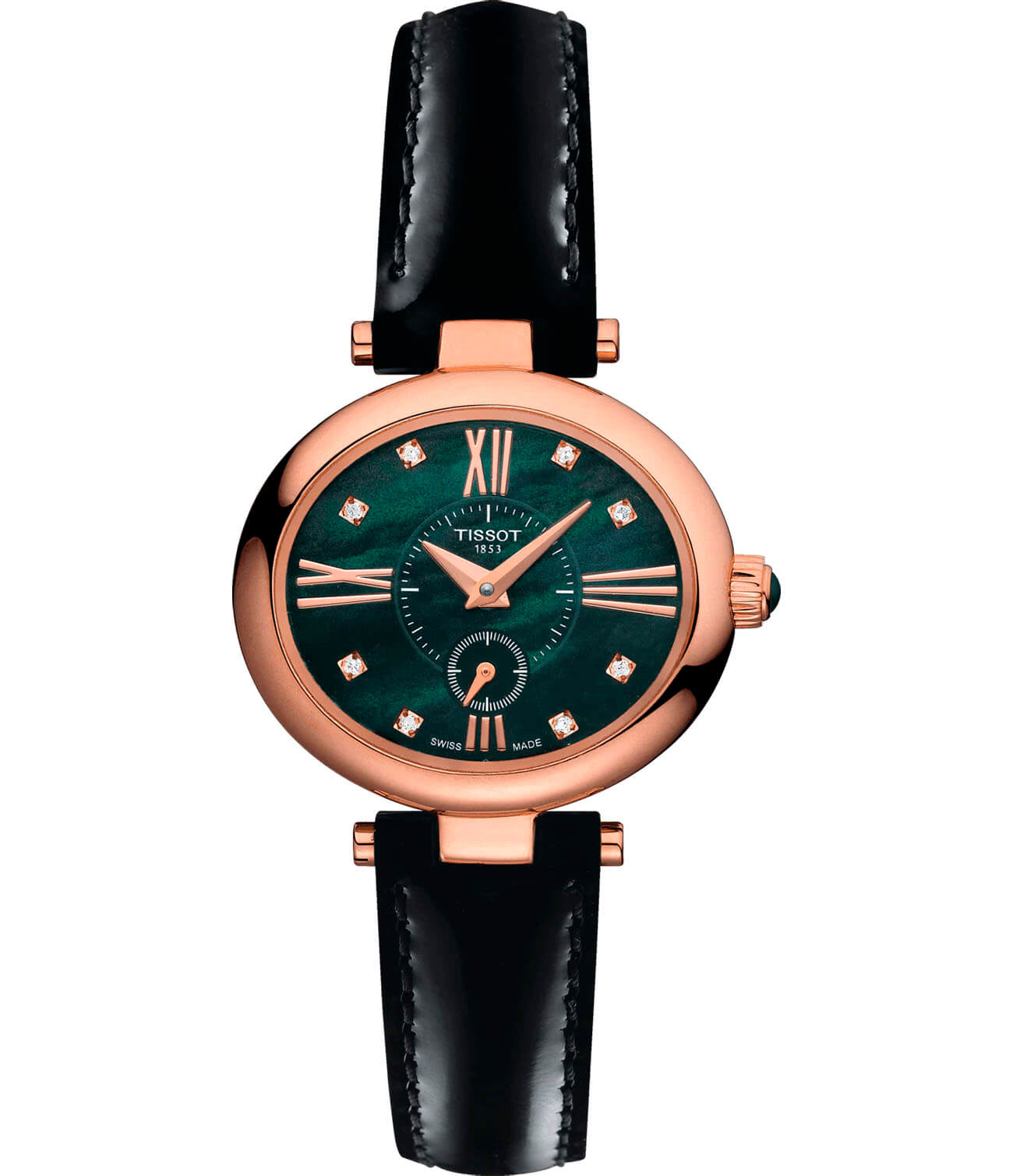 Премиальная модель является настоящим эксклюзивом, в ней прекрасна каждая деталь. Овальный перламутровый циферблат изумрудного цвета инкрустирован 8 бриллиантами цвета Top Wesselton, их сияние идеально сочетается с корпусом из 18-каратного розового золота18-каратное золотоОбозначение по каратной системе пробирования, оно показывает, сколько драгоценного металла содержится в изделии. 18 карат - в составе 75% чистого золота, соответствует 750 пробе.