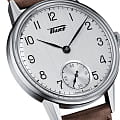 Классические часы обладают минималистичным белым циферблатом с арабскими цифрами, вы не увидите ни одной лишней детали. Оригинально смотрится отдельно вынесенный секундный счётчик. Модель с автоматической системой завода оснащена механизмом ETA 6498-1 с запасом хода до 46 часов. Прозрачная задняя крышка позволяет разглядеть не только движение деталей, но и полюбоваться узором «женевские волны». Сапфировое стекло с антибликовым покрытием. Коричневый ремешок из натуральной кожи. . Водостойкость 50 метров. Габариты: 42 x 42 x 11,4 мм.