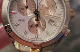Спортивные элементы дизайна переплетаются с классическими, весьма женственно выглядят нежно-розовые счётчики и стрелки. Модель и центральный ряд звеньев браслета имеют PVD-покрытиеPVDУльтратонкое покрытие наносится в технике вакуумного напыления, сочетает в себе нитрид титана особой прочности со слоем золота или оксида хрома. Несёт в себе декоративную или защитную функцию. корпуса в цвете розового золота. Кварцевый калибр ETA G15.212 обеспечивает высокую точность хода. Водонепроницаемость при давлении 10 бар. Безопасная застёжка не допустит случайное расстёгивание браслета. Окошко даты, секундомер. Габариты: 38 x 38 x 10,5 мм.