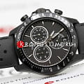 Стильный аксессуар полностью выполнен в чёрном цвете, исключение составляют лишь серебристые часовые метки и стрелки, а также ободок счётчиков хронографаХронографФункция позволяет измерять отрезки времени с особой точностью: часы, минуты, секунды. Верным признаком хронографа является наличие на циферблате 3 дополнительных окошек-счётчиков.. Подобный дизайн считается универсальным, что делает возможным носить часы с любой одеждой. Кварцевый механизм ETA G10.212. PVD-покрытиеPVDУльтратонкое покрытие наносится в технике вакуумного напыления, сочетает в себе нитрид титана особой прочности со слоем золота или оксида хрома. Несёт в себе декоративную или защитную функцию. корпуса. Люминесцентная подсветкаЛюминесцентное покрытиеПозволяет считывать показания времени в темноте. Производители наносят на стрелки, часовые индексы, безель или поверхность циферблата светонакопительный состав, дающий холодное свечение.. Опции: секундомер, тахиметрТахиметрРазмеченная шкала, располагается на ободке или безеле часов. Тахиметр позволяет рассчитать скорость на определённом участке пути, расстояние измеряется в километрах или милях., индикация даты. Габариты: 42,5 x 42,5 x 11,2 мм.