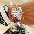 Наручные часы будут идеально смотреться в любой ситуации, навсегда оставаясь модным и актуальным аксессуаром. Циферблат из белого перламутра дополнен изящными стрелками, по форме напоминающие лепестки. Стальные корпус и браслет имеют PVD-покрытиеPVDУльтратонкое покрытие наносится в технике вакуумного напыления, сочетает в себе нитрид титана особой прочности со слоем золота или оксида хрома. Несёт в себе декоративную или защитную функцию. цвета розового золота, устойчивое к истиранию. Кварцевый механизм ETA F04.111. Стекло из сапфира. . Функция EOLEOLПредставляет собой систему, уведомляющую владельца часов о необходимости замены элемента питания. За 2 недели до полного разряда батарейки секундная стрелка перестаёт ходить чётко и начинает перепрыгивать на 3-4 деления.. Габариты: 30 x 30 x 8,7 мм.