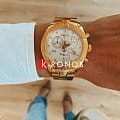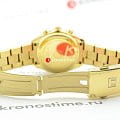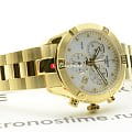 Стильный хронографХронографФункция позволяет измерять отрезки времени с особой точностью: часы, минуты, секунды. Верным признаком хронографа является наличие на циферблате 3 дополнительных окошек-счётчиков. наделён женственным внешним обликом. Перламутровый циферблат дополнен драгоценными камнями, вместо часовых индексов используются 12 бриллиантов в 0,0456 карат. Швейцарский кварцевый механизм ETA G15.212. Сапфировое стекло не допускает возникновения царапин. Водонепроницаемость до 10 бар. PVD-покрытиеPVDУльтратонкое покрытие наносится в технике вакуумного напыления, сочетает в себе нитрид титана особой прочности со слоем золота или оксида хрома. Несёт в себе декоративную или защитную функцию. золотистого цвета. Стрелки с люминесцентной подсветкойЛюминесцентное покрытиеПозволяет считывать показания времени в темноте. Производители наносят на стрелки, часовые индексы, безель или поверхность циферблата светонакопительный состав, дающий холодное свечение.. Браслет с . Отображение даты, секундомер. Габариты: 38 x 38 x 10,5 мм.