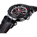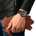 Аксессуар Limited Edition стал отражением скоростной стилистики. Динамичное оформление с мотогоночным дизайном позволит выгодно подчеркнуть повседневный образ. Массивный безельБезельВнешний ободок, закрепляющий стекло. В спортивных часах так называется поворотное кольцо с делениями на циферблате, выполняет роль таймера – замеряет отрезки времени на шкале. Неподвижный безель – элемент декора. Однонаправленно вращающийся безель на дайверских часах позволяет фиксировать моменты погружения и выныривания на поверхность. стилизован под шину мотоцикла, фактурный циферблат с красными акцентами добавляет спортивности. Задняя крышка дополнена узнаваемой гравировкой. Часы – чемпионы не только на трассе, но и в измерении времени. Высокую точность хода обеспечивает швейцарский кварцевый калибр ETA G10.212. Стекло из сапфира с покрытием "антиблик". Перфорированный каучуковый ремешок с кожаной текстурой. Люминесцентная подсветкаЛюминесцентное покрытиеПозволяет считывать показания времени в темноте. Производители наносят на стрелки, часовые индексы, безель или поверхность циферблата светонакопительный состав, дающий холодное свечение.. Корпус из стали 316L с черным PVD-покрытиемPVDУльтратонкое покрытие наносится в технике вакуумного напыления, сочетает в себе нитрид титана особой прочности со слоем золота или оксида хрома. Несёт в себе декоративную или защитную функцию.. Водостойкость 100 метров. Секундомер, тахиметрТахиметрРазмеченная шкала, располагается на ободке или безеле часов. Тахиметр позволяет рассчитать скорость на определённом участке пути, расстояние измеряется в километрах или милях., индикация числа, хронографХронографФункция позволяет измерять отрезки времени с особой точностью: часы, минуты, секунды. Верным признаком хронографа является наличие на циферблате 3 дополнительных окошек-счётчиков.. Габариты: 47,6 x 43 x 12,71 мм.
