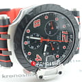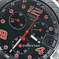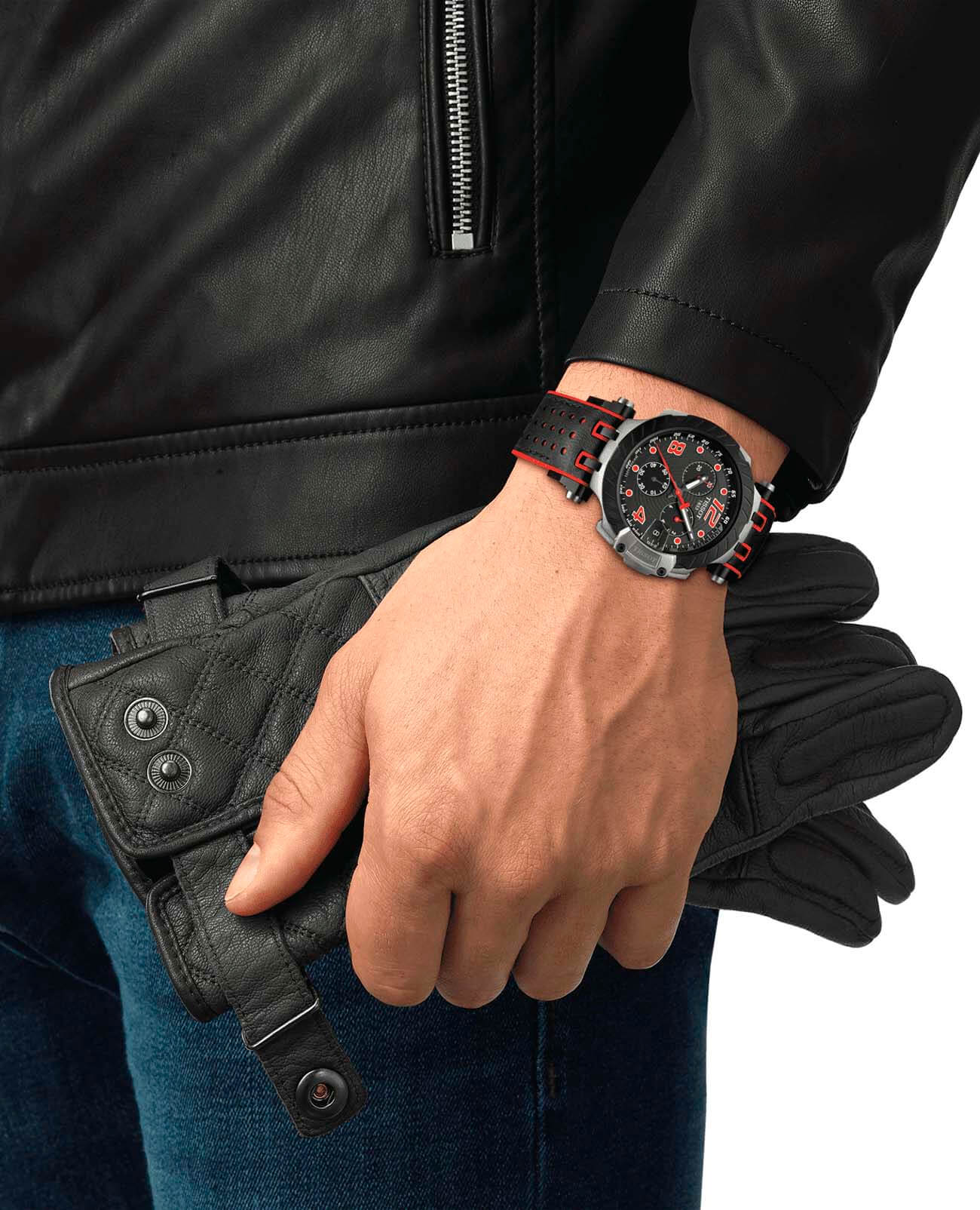 Эпатажные мужские часы из коллекции T-Race отражают динамику мотогоночных соревнований и чемпионский характер. Оригинальный аксессуар выполнен в спортивном стиле, характерно наличие крупных деталей, яркая расцветка, отсылка к деталям гоночных мотоциклов. Задняя крышка корпуса сделана в виде колеса, безельБезельВнешний ободок, закрепляющий стекло. В спортивных часах так называется поворотное кольцо с делениями на циферблате, выполняет роль таймера – замеряет отрезки времени на шкале. Неподвижный безель – элемент декора. Однонаправленно вращающийся безель на дайверских часах позволяет фиксировать моменты погружения и выныривания на поверхность. напоминает тормозную колодку. Наручные часы оснащены кварцевым механизмом швейцарского производства ETA G10.212. ХронографХронографФункция позволяет измерять отрезки времени с особой точностью: часы, минуты, секунды. Верным признаком хронографа является наличие на циферблате 3 дополнительных окошек-счётчиков. позволяет измерять показатели с особой точностью. Чёрное PVD-покрытиеPVDУльтратонкое покрытие наносится в технике вакуумного напыления, сочетает в себе нитрид титана особой прочности со слоем золота или оксида хрома. Несёт в себе декоративную или защитную функцию. корпуса. Сапфировое стекло. Водостойкость при давлении 10 бар. Секундомер, индикация даты. Габариты: 43 x 46,7 x 12,7 мм. Производство и сборка: Швейцария.