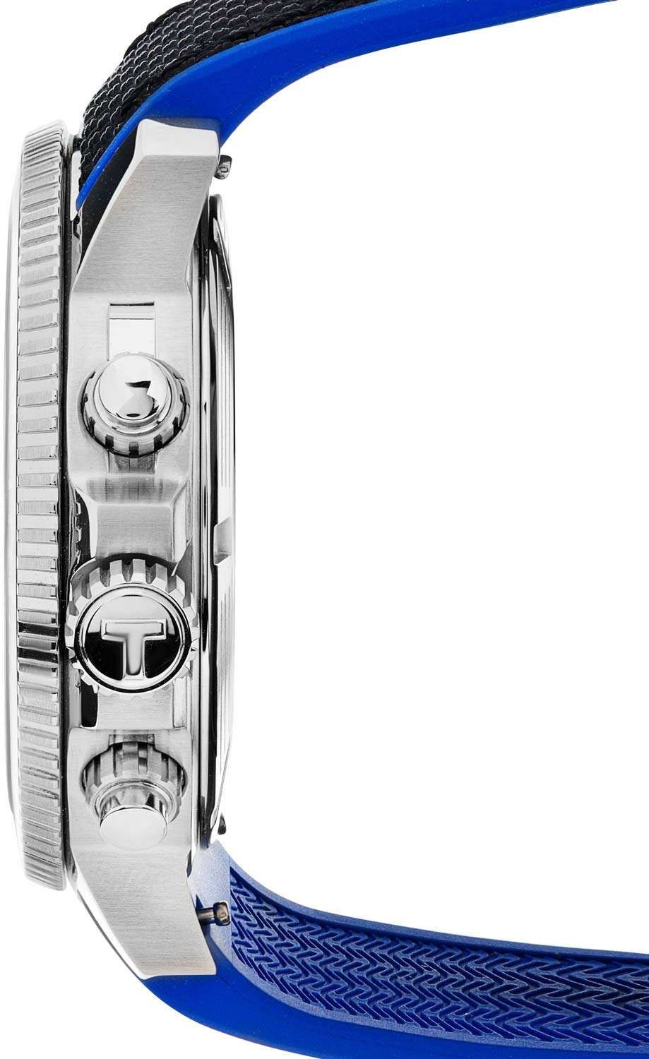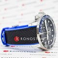 Наручные часы отличаются спортивным дизайном, прослеживается дайверская тематика, чему способствует и водонепроницаемость при давлении 30 бар на глубине 300 метров. Кварцевый механизм ETA G10.212. Керамический безельБезельВнешний ободок, закрепляющий стекло. В спортивных часах так называется поворотное кольцо с делениями на циферблате, выполняет роль таймера – замеряет отрезки времени на шкале. Неподвижный безель – элемент декора. Однонаправленно вращающийся безель на дайверских часах позволяет фиксировать моменты погружения и выныривания на поверхность. Сапфировое стекло с антибликовым покрытием. Завинчивающаяся заводная головка и задняя крышка. Люминесцентная подсветкаЛюминесцентное покрытиеПозволяет считывать показания времени в темноте. Производители наносят на стрелки, часовые индексы, безель или поверхность циферблата светонакопительный состав, дающий холодное свечение.. Черно-синий тканевый ремешок. Секундомер, хронографХронографФункция позволяет измерять отрезки времени с особой точностью: часы, минуты, секунды. Верным признаком хронографа является наличие на циферблате 3 дополнительных окошек-счётчиков., календарь. Габариты: 45 x 45 x 12,8 мм.