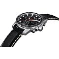 Современный хронографХронографФункция позволяет измерять отрезки времени с особой точностью: часы, минуты, секунды. Верным признаком хронографа является наличие на циферблате 3 дополнительных окошек-счётчиков. поможет подчеркнуть продуманный образ делового мужчины. Модель выполнена в спокойной серебристо-чёрной расцветке, исключение – ярко-красные стрелки, измеряющие секунды. Спортивный дух выражается в ремешке из натуральной кожи с прострочкой, чёрном безелеБезельВнешний ободок, закрепляющий стекло. В спортивных часах так называется поворотное кольцо с делениями на циферблате, выполняет роль таймера – замеряет отрезки времени на шкале. Неподвижный безель – элемент декора. Однонаправленно вращающийся безель на дайверских часах позволяет фиксировать моменты погружения и выныривания на поверхность. со шкалой тахиметраТахиметрРазмеченная шкала, располагается на ободке или безеле часов. Тахиметр позволяет рассчитать скорость на определённом участке пути, расстояние измеряется в километрах или милях.. Наручные часы функционируют благодаря швейцарскому кварцевому механизму ETA G10.212. Калибр отличается максимальной точностью хода. Стекло из сапфира. Водостойкость 100 метров. Надёжный корпус из антикоррозионной стали 316L. Люминесцентная подсветкаЛюминесцентное покрытиеПозволяет считывать показания времени в темноте. Производители наносят на стрелки, часовые индексы, безель или поверхность циферблата светонакопительный состав, дающий холодное свечение. стрелок и индексов. Секундомер, отображение даты. Диаметр корпуса: 45,5 мм.
