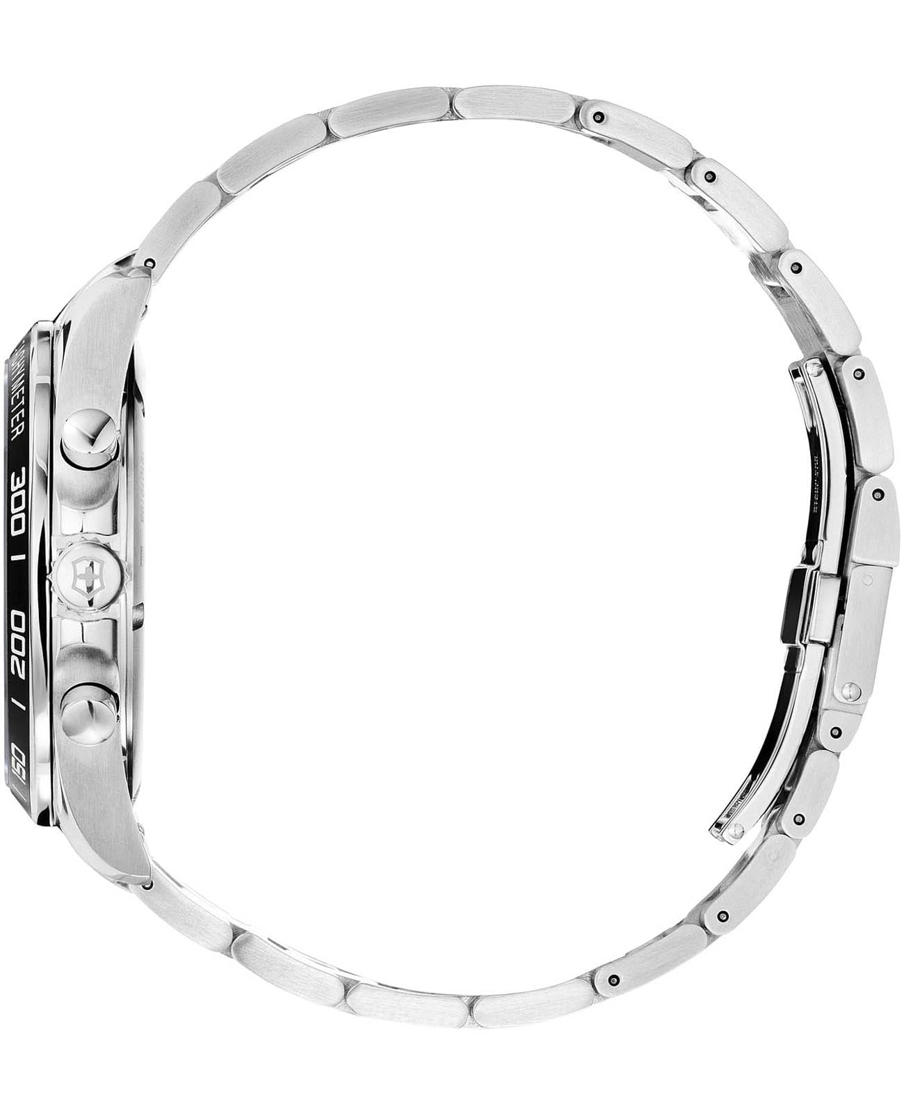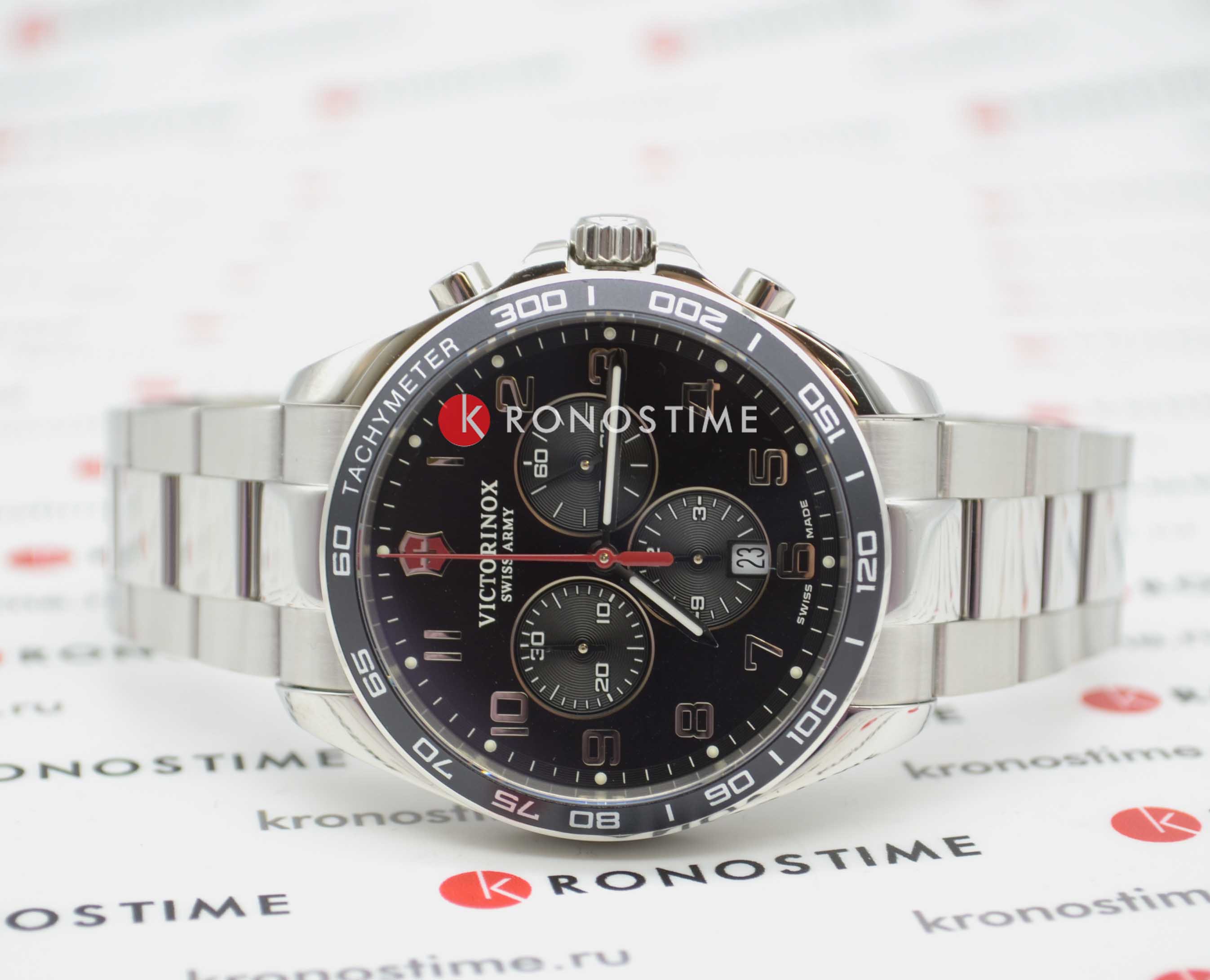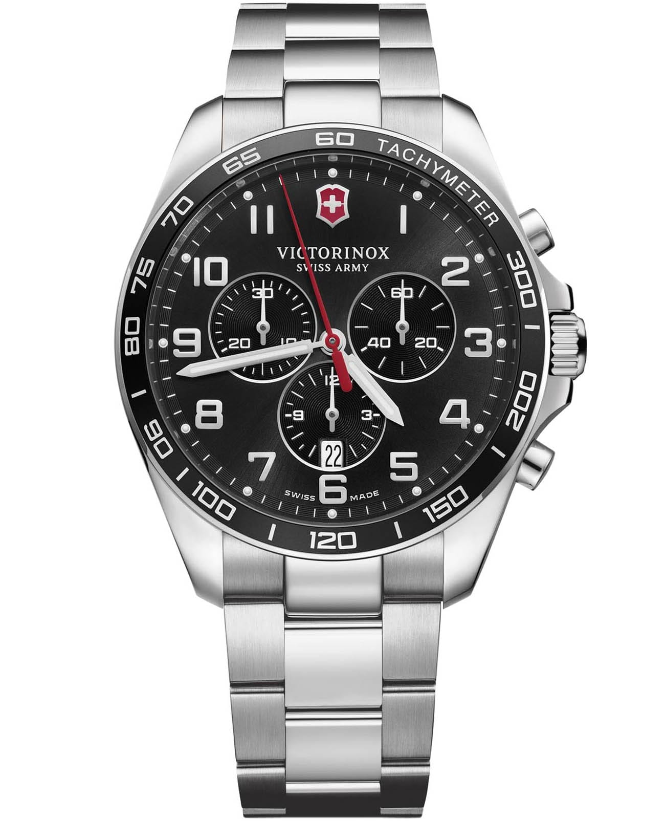 Мужские швейцарские часы-хронографХронографФункция позволяет измерять отрезки времени с особой точностью: часы, минуты, секунды. Верным признаком хронографа является наличие на циферблате 3 дополнительных окошек-счётчиков. Victorinox Fieldforce Chronograph 241899 с надёжным кварцевым механизмом. Сапфировое стеклоСапфировое стеклоПрочный и надёжный материал из кристалла сапфира синтетического происхождения, характеризующийся особой твёрдостью и устойчивостью к царапинам и повреждениям. с трёхслойным антибликовым покрытием. Корпус часов выполнен из нержавеющей стали 316L. Стальной браслет на раскладной застёжкеРаскладная застёжкаТакой тип застёжки используется только на браслетах из металла. Она никогда не раскрывается полностью, происходит разделение на 2 и более частей. Раскладывающая застёжка снизит вероятность потери часов к минимуму.. Влагозащита: 100 метров, позволит плавать, нырять и заниматься другими водными видами спорта. Окошко даты находится в положении 6 часов, стрелки и метки с люминесцентным покрытиемЛюминесцентное покрытиеПозволяет считывать показания времени в темноте. Производители наносят на стрелки, часовые индексы, безель или поверхность циферблата светонакопительный состав, дающий холодное свечение., тахиметрТахиметрРазмеченная шкала, располагается на ободке или безеле часов. Тахиметр позволяет рассчитать скорость на определённом участке пути, расстояние измеряется в километрах или милях..
