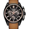 Мужские кварцевые часы-хронографХронографФункция позволяет измерять отрезки времени с особой точностью: часы, минуты, секунды. Верным признаком хронографа является наличие на циферблате 3 дополнительных окошек-счётчиков. с секундомеромСекундомерСекундоме́р — прибор, способный измерять интервалы времени с точностью до долей секунды. Wainer WA.16101-A сочетает элегантный дизайн и высокое качество исполнения. Корпус выполнен из нержавеющей стали с PVD-покрытиемPVDУльтратонкое покрытие наносится в технике вакуумного напыления, сочетает в себе нитрид титана особой прочности со слоем золота или оксида хрома. Несёт в себе декоративную или защитную функцию. черного цвета, диаметром 44 мм и толщиной 11 мм, обеспечивает прочность и долговечность. Циферблат с метками в виде штрихов выполнен по технологии Sunray (солнечные лучи) и украшен фирменным логотипом Wainer. Секундная стрелка на конце декорирована логотипом бренда - буквой W. Сапфировое стеклоСапфировое стеклоПрочный и надёжный материал из кристалла сапфира синтетического происхождения, характеризующийся особой твёрдостью и устойчивостью к царапинам и повреждениям. защищает дисплей от царапин и механических повреждений. Окошко даты находится в положении между отметками 4 и 5 часов. Стрелки с люминесцентным покрытиемЛюминесцентное покрытиеПозволяет считывать показания времени в темноте. Производители наносят на стрелки, часовые индексы, безель или поверхность циферблата светонакопительный состав, дающий холодное свечение., улучшая читаемость в условиях недостаточного освещения. БезельБезельВнешний ободок, закрепляющий стекло. В спортивных часах так называется поворотное кольцо с делениями на циферблате, выполняет роль таймера – замеряет отрезки времени на шкале. Неподвижный безель – элемент декора. Однонаправленно вращающийся безель на дайверских часах позволяет фиксировать моменты погружения и выныривания на поверхность. с PVD-покрытиемPVDУльтратонкое покрытие наносится в технике вакуумного напыления, сочетает в себе нитрид титана особой прочности со слоем золота или оксида хрома. Несёт в себе декоративную или защитную функцию. золотисто-черного цвета. Кожаный ремешок на силиконовой основе и стандартной застёжкой обеспечивает комфортное ношение. Водонепроницаемость до 100 метров делает модель подходящей для плавания и активного образа жизни. Wainer — это стильный и надежный аксессуар для тех, кто ценит швейцарское качество и современные технологии.