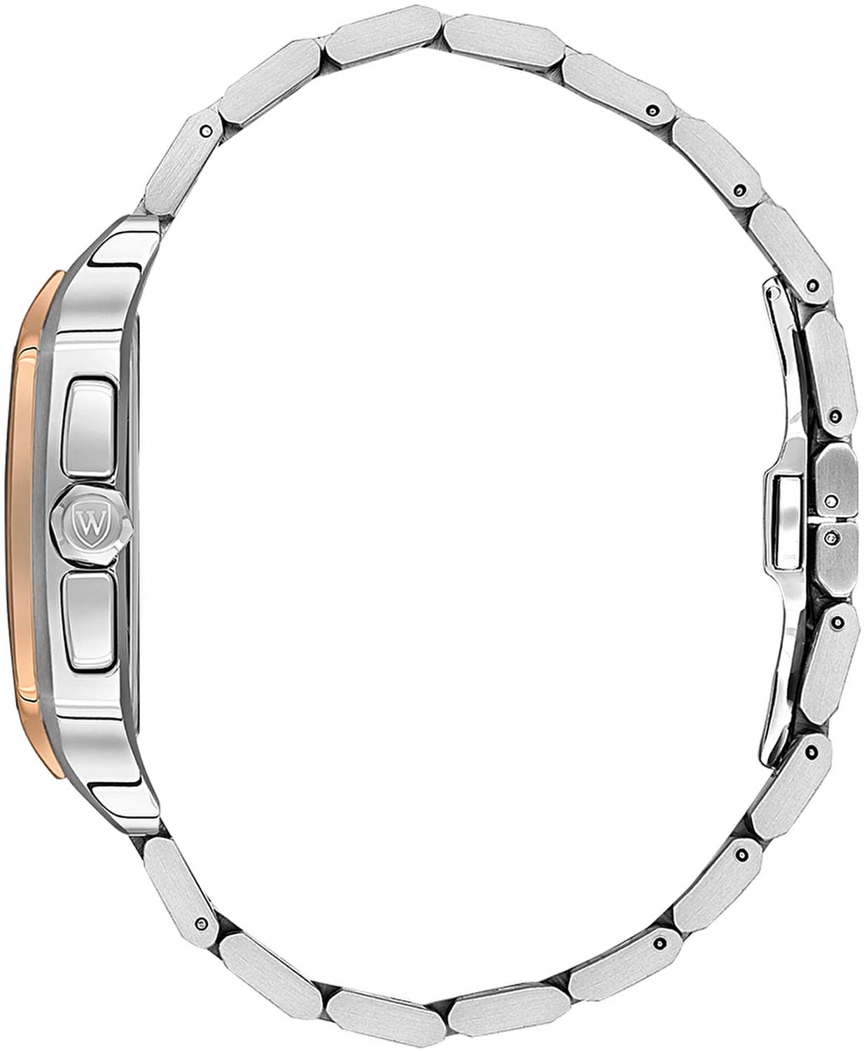 Мужские кварцевые часы Wainer WA.18090-F — это стильный аксессуар, сочетающий в себе швейцарское качество и изысканный дизайн. Модель выполнена в квадратной форме из стали 316L с частичным PVD-покрытиемPVDУльтратонкое покрытие наносится в технике вакуумного напыления, сочетает в себе нитрид титана особой прочности со слоем золота или оксида хрома. Несёт в себе декоративную или защитную функцию., что придаёт ей благородный внешний вид и устойчивость к царапинам. Корпус украшен декоративными винтами, подчёркивая внимание к деталям. Циферблат белого цвета дополнен штриховыми метками и римскими цифрами, а секундная стрелка на конце декорирована буквой W, добавляя модели индивидуальности. Защиту механизма обеспечивает сапфировое стеклоСапфировое стеклоПрочный и надёжный материал из кристалла сапфира синтетического происхождения, характеризующийся особой твёрдостью и устойчивостью к царапинам и повреждениям., устойчивое к повреждениям. Окошко даты расположено в положении 4 часов, а гранёная заводная головка с защитой оснащена фирменным логотипом. Браслет из стали 316L шириной 22 мм оснащён Раскладная застёжкаРаскладная застёжкаТакой тип застёжки используется только на браслетах из металла. Она никогда не раскрывается полностью, происходит разделение на 2 и более частей. Раскладывающая застёжка снизит вероятность потери часов к минимуму., обеспечивающей комфорт и надёжную фиксацию на запястье. Водонепроницаемость позволяет использовать модель при мытье рук или под лёгким дождём. Стрелки с люминесцентным покрытиемЛюминесцентное покрытиеПозволяет считывать показания времени в темноте. Производители наносят на стрелки, часовые индексы, безель или поверхность циферблата светонакопительный состав, дающий холодное свечение. обеспечивают отличную читаемость даже в условиях слабого освещения. Механизм калибра Ronda 5030.D гарантирует точность хода и надёжность. Эти часы станут универсальным аксессуаром для тех, кто ценит сочетание стиля, функциональности и швейцарского мастерства — идеальный выбор для повседневной носки и торжественных случаев.