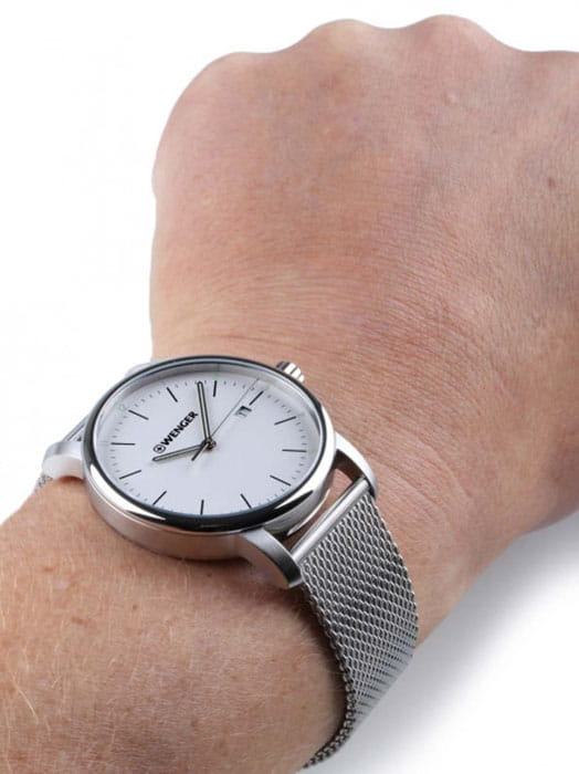 Швейцарские мужские часы в классическом стиле Wenger 01.1741.113, кварцевый механизм с высокой точностью. Класс водозащиты: 100 метров, позволит плавать, нырять и заниматься другими водными видами спорта. Корпус часов изготовлен из стали, серебристого цвета.
