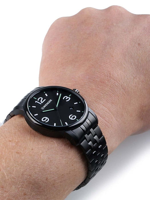Швейцарские мужские часы в классическом стиле Wenger 01.1741.119, кварцевый механизм с высокой точностью. Класс водозащиты: 100 метров, позволит плавать, нырять и заниматься другими водными видами спорта. Корпус часов изготовлен из стали, черного цвета.