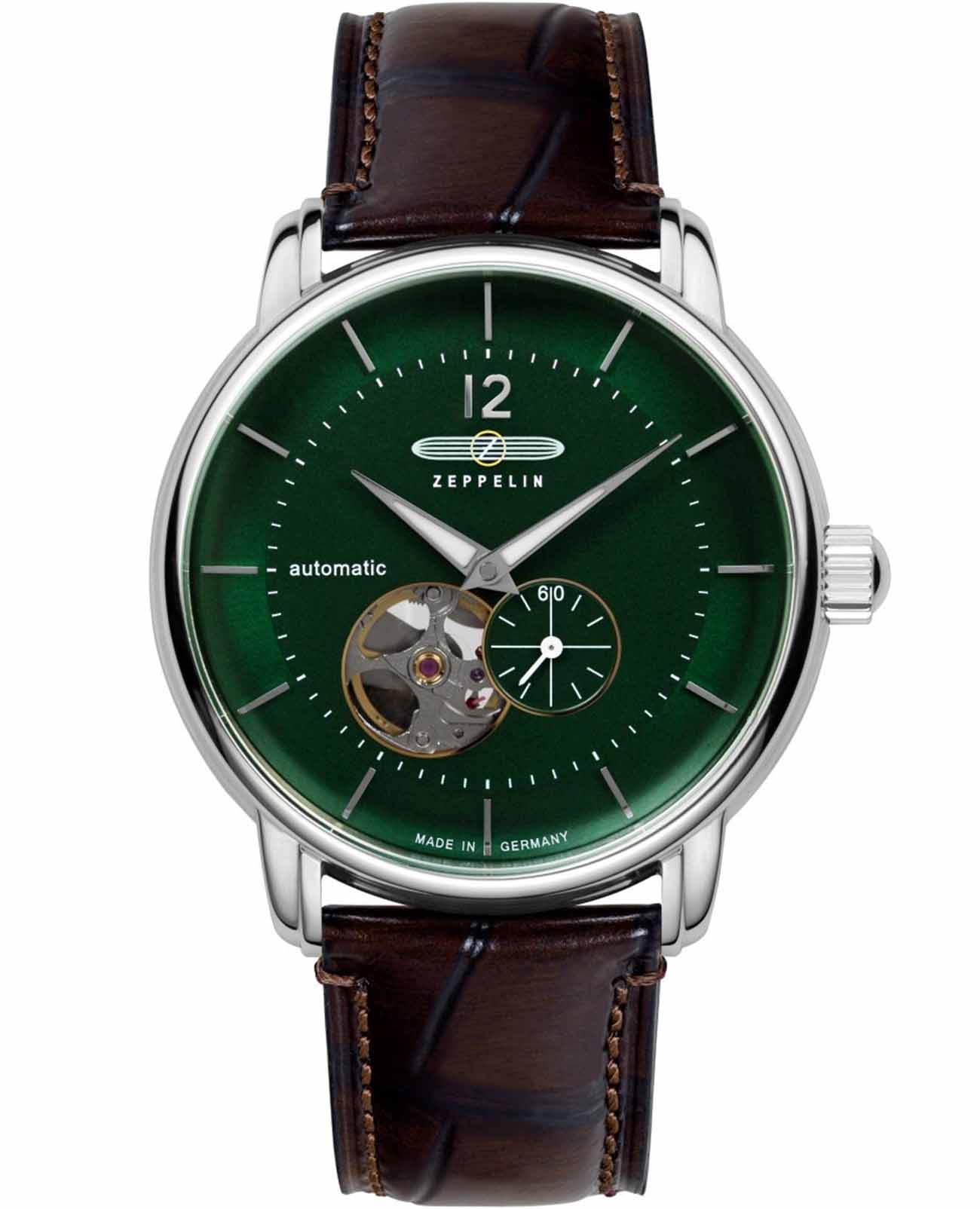 Часы Zeppelin 81664— это элегантные мужские часы с автоподзаводом, которые поражают своим классическим стилем и точностью исполнения. Корпус из нержавеющей стали серебристого цвета гармонично сочетается с зеленым циферблатом, украшенным окошком даты в положении 3 часа, а секундная стрелка вынесена на малый циферблат. Механизм 82S5 Miyota обеспечивает надежность. Циферблат защищен закаленным минеральным стекломМинеральное стеклоМинеральное стекло представляет собой искусственно выращенный минерал кварца. Такое стекло отличается особой устойчивостью к повреждениям и царапинам. Уступает по некоторым качествам сапфировому стеклу., а коричневый кожаный ремешок придает ему элегантный вид. Стрелки покрыты люминесцентным покрытиемЛюминесцентное покрытиеПозволяет считывать показания времени в темноте. Производители наносят на стрелки, часовые индексы, безель или поверхность циферблата светонакопительный состав, дающий холодное свечение.. Водонепроницаемость часов достигает 50 метров, что делает их идеальным выбором для повседневного ношения.