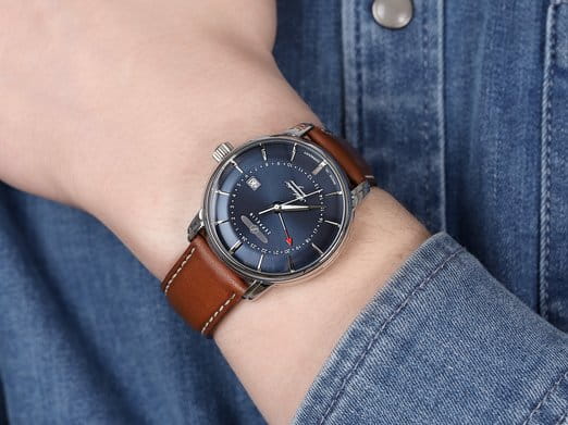 Часы Zeppelin 8442-3 — это изделие, которое идеально сидит на мужском запястье. Уникальный циферблат модели темно-синего цвета отличается светящимися стрелками и индексами благодаря люминесцентному покрытиюЛюминесцентное покрытиеПозволяет считывать показания времени в темноте. Производители наносят на стрелки, часовые индексы, безель или поверхность циферблата светонакопительный состав, дающий холодное свечение. и покрыт закаленным минеральным стекломМинеральное стеклоМинеральное стекло представляет собой искусственно выращенный минерал кварца. Такое стекло отличается особой устойчивостью к повреждениям и царапинам. Уступает по некоторым качествам сапфировому стеклу.. Корпус из полированной стали крепится к классическому коричневому кожаному ремешку. Дополнительной функцией часов является отображение дня месяца в положении "3 часа" и указателя GMTGMTОтображение времени второго часового пояса.Такая функция особенно актуальна для путешественников и бизнесменов,которые общаются с людьми из разных стран,теперь вы всегда будете знать,какой час у вашего партнёра или близкого человека., который позволяет устанавливать и считывать показания второго часового пояса. Водонепроницаемость до 50 метров обеспечивает защиту от возможных брызг. Эти часы подойдут для повседневного ношения и станут ярким акцентом в вашем наряде.